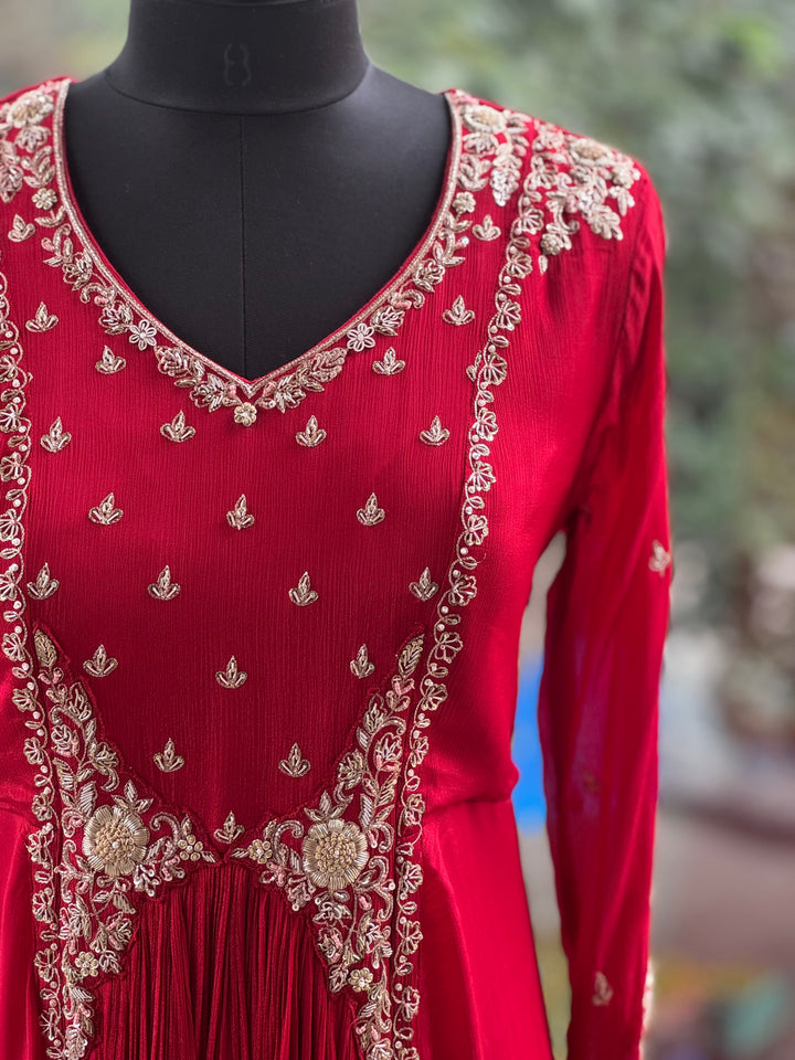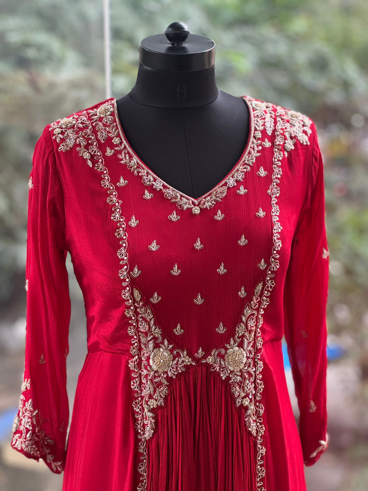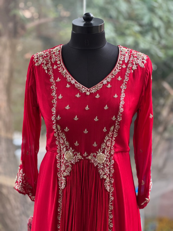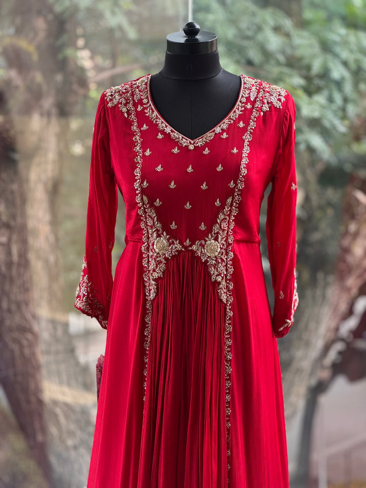 Pure crepe silk red V neck handwork gown.