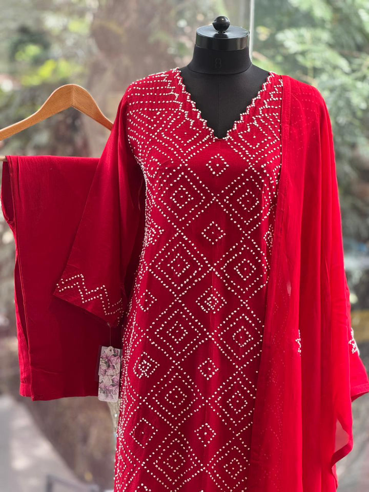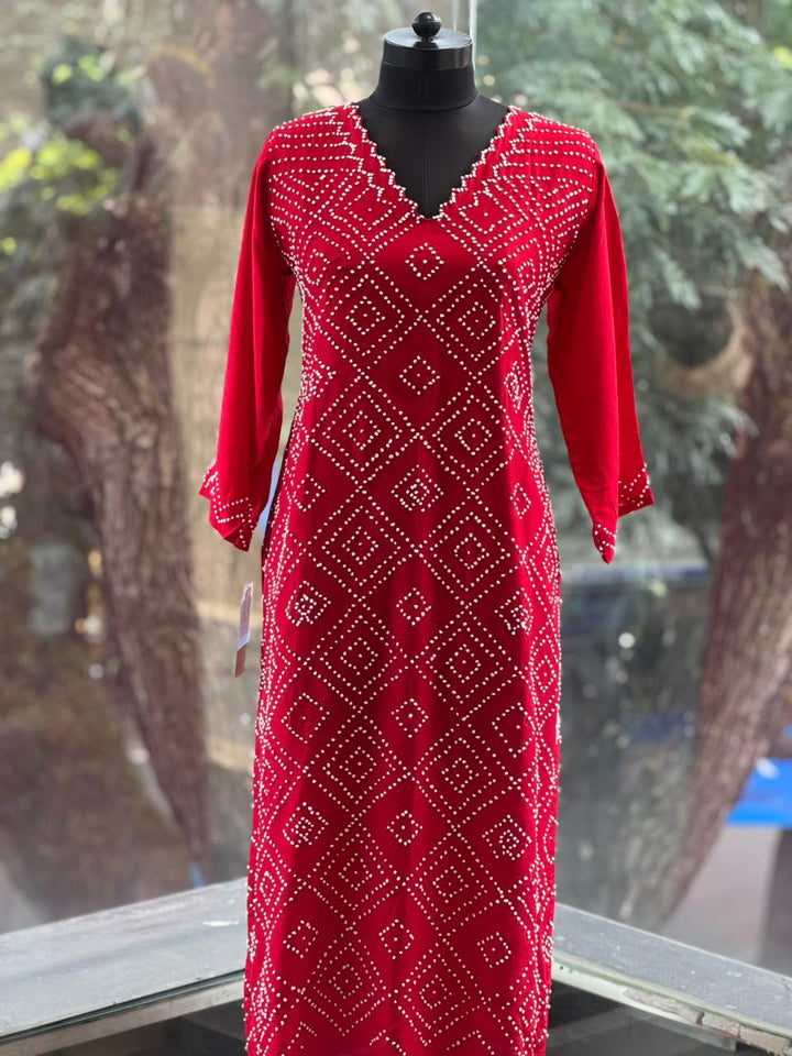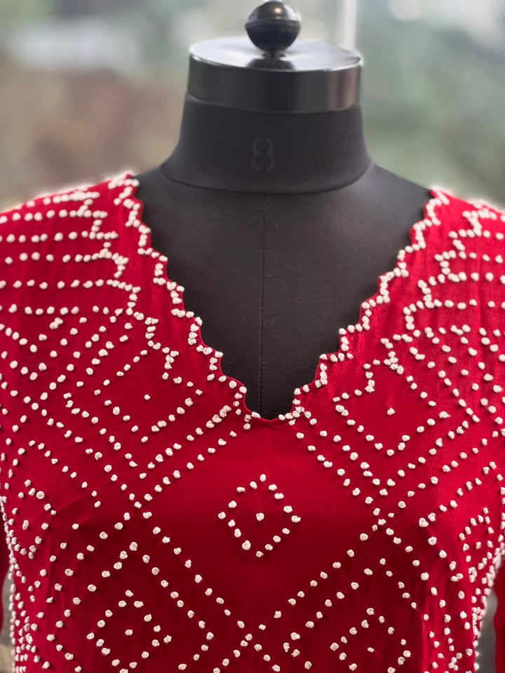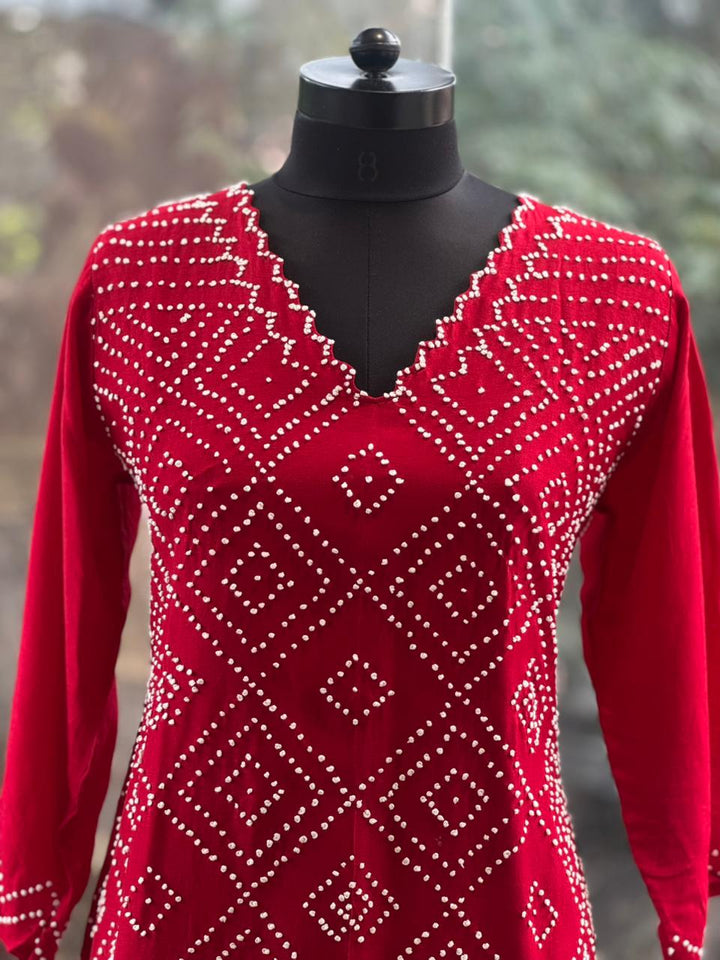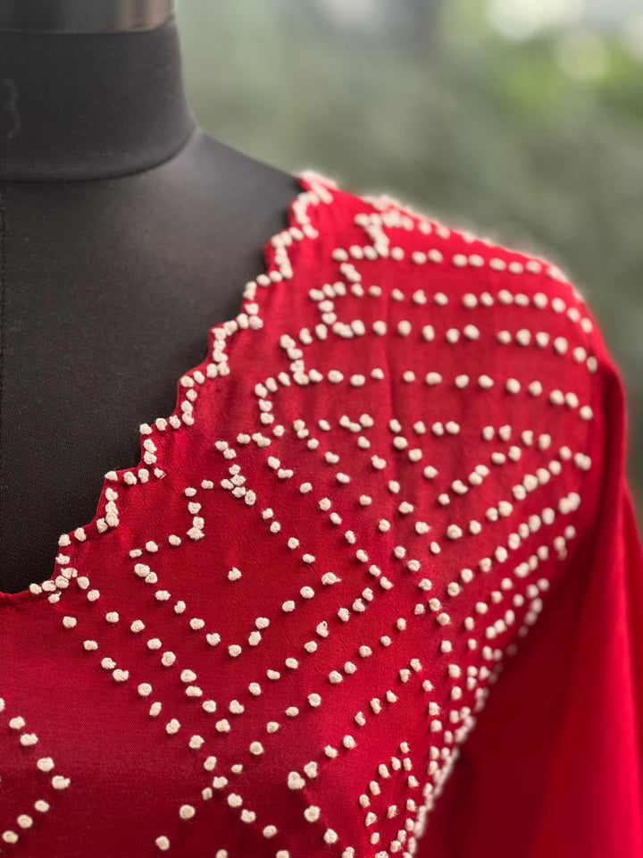 Pure silk pastel red straight cut jaal knot work kurta, comes with comfort fit pants and soft silk dupatta.