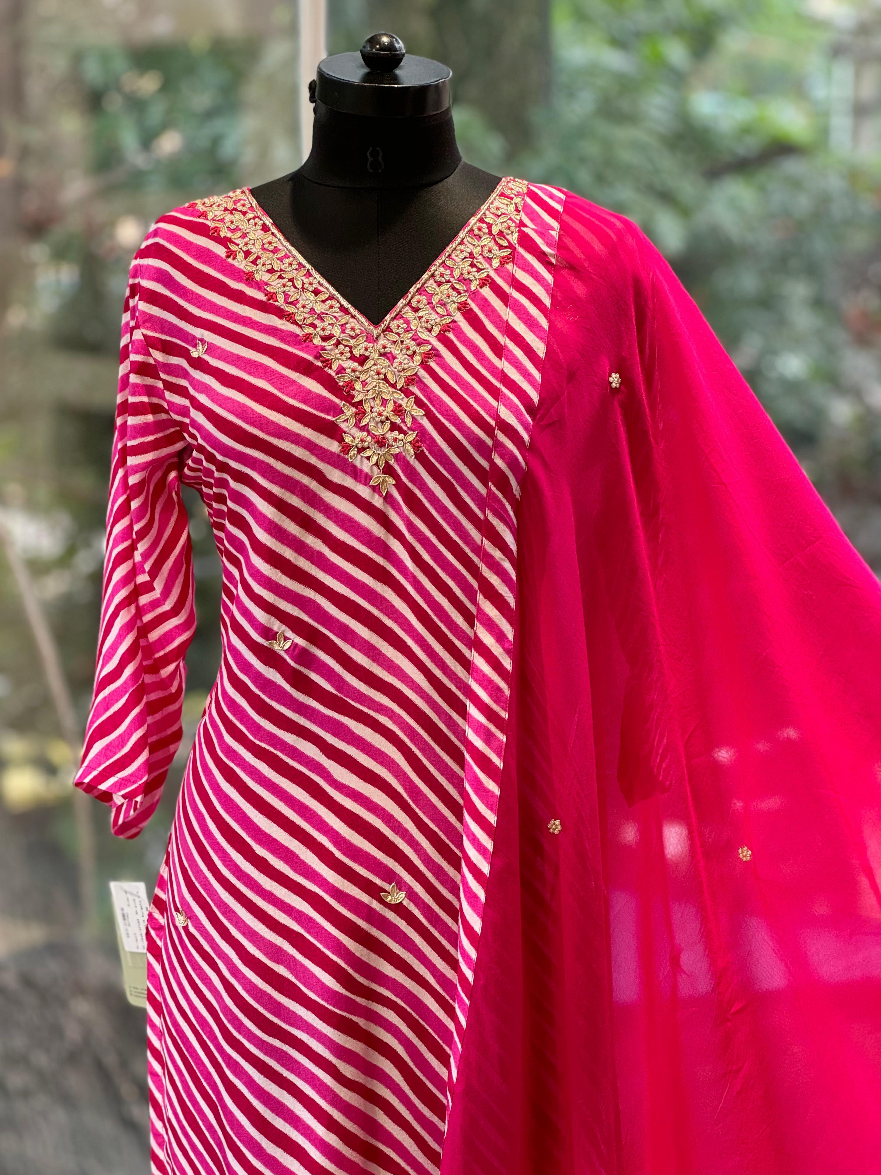 Pure silk gota and zardozi work on neck leheriya straight cut kurta with straight comfort pants and silk organza dupatta.