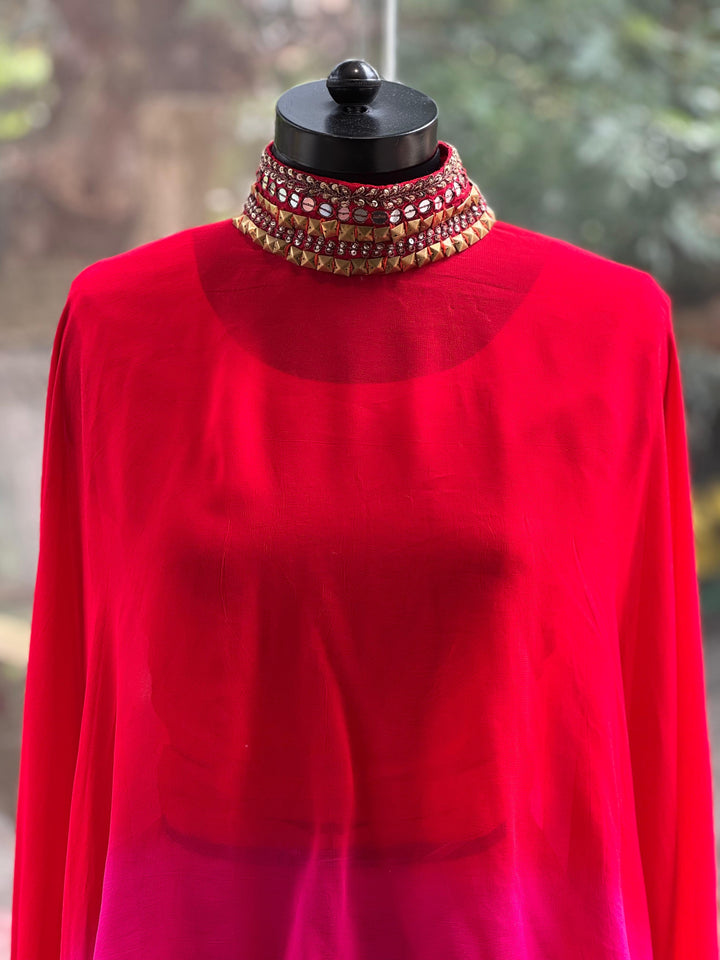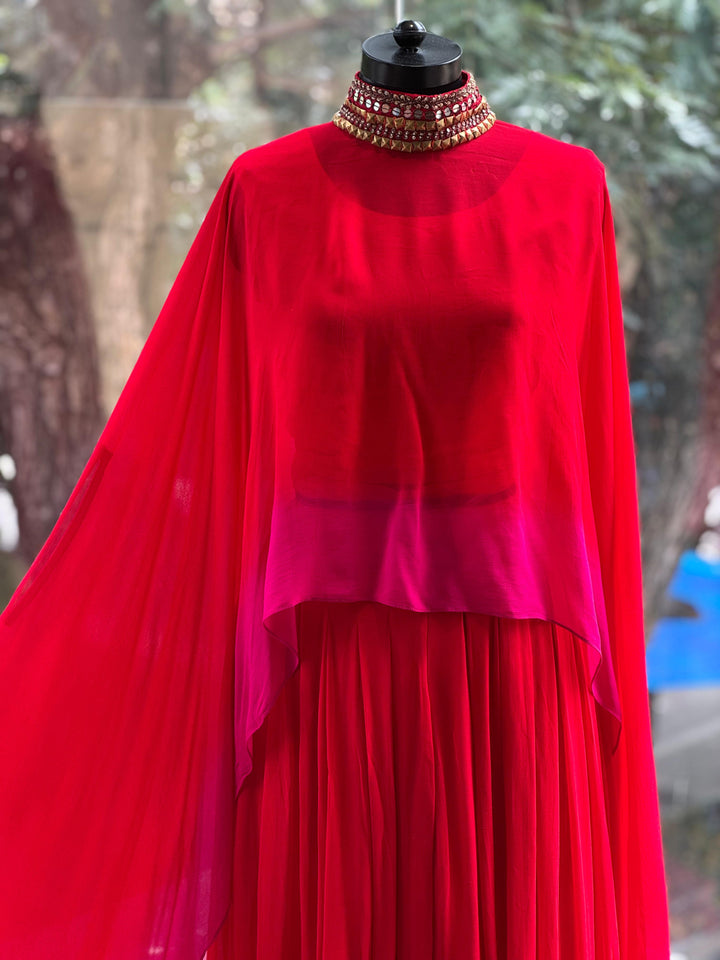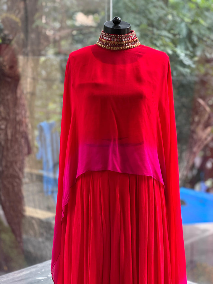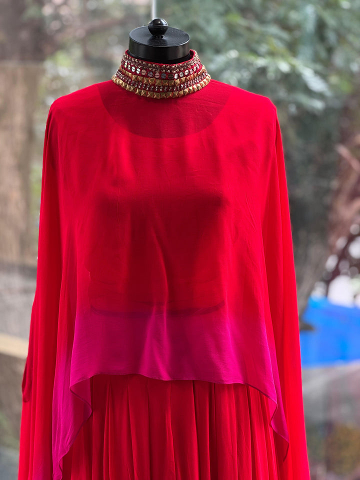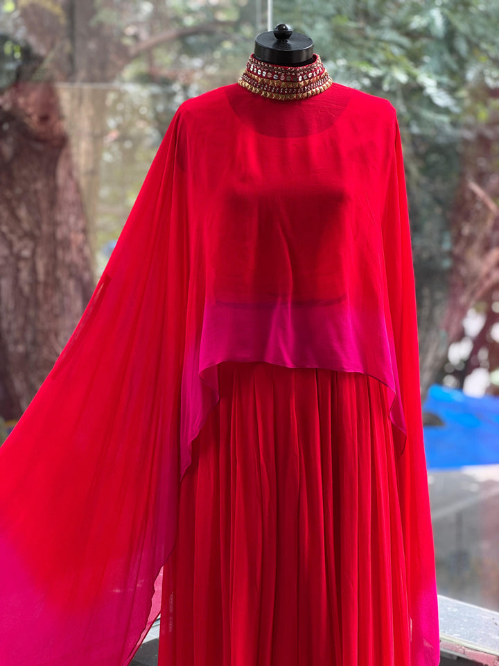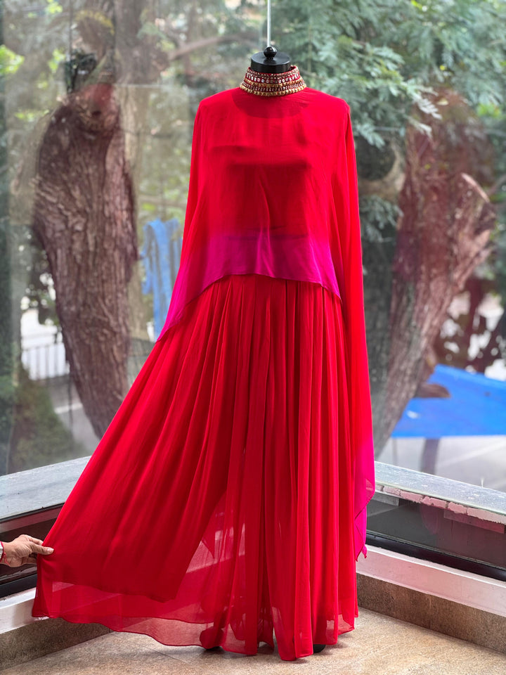 Pure crepe silk shaded cape with hand work on neckline. Comes with sleeveless inner & wide leg pants.