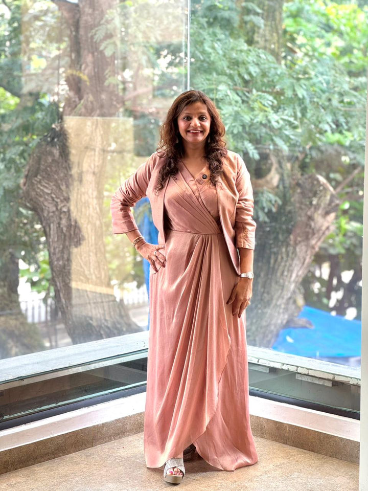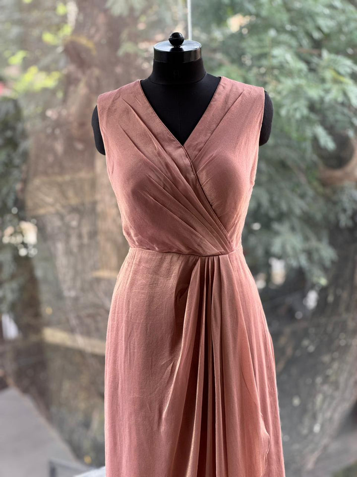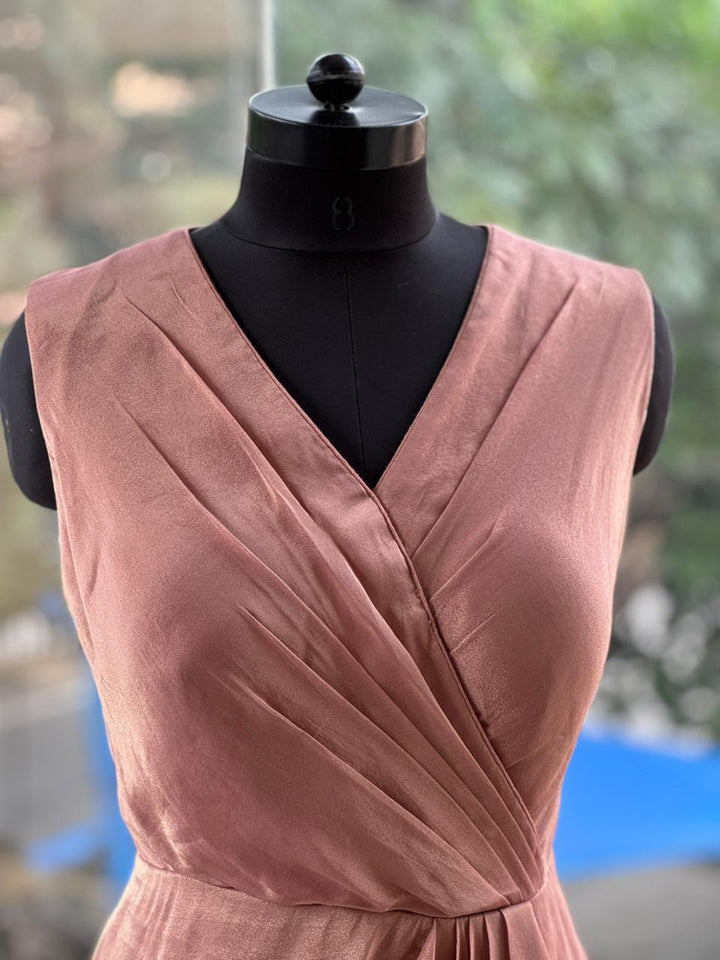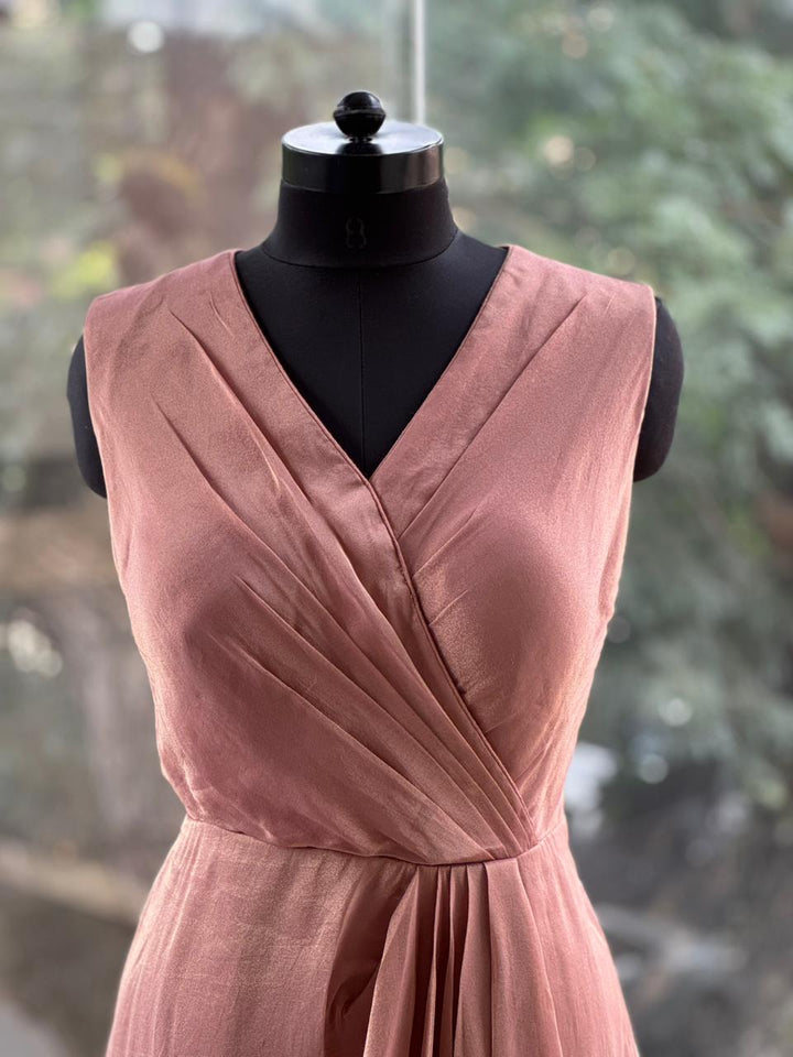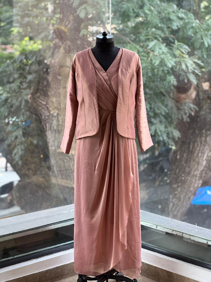 Pute glass tissue V neck rose gold pleated dress with glass tissue jacket.