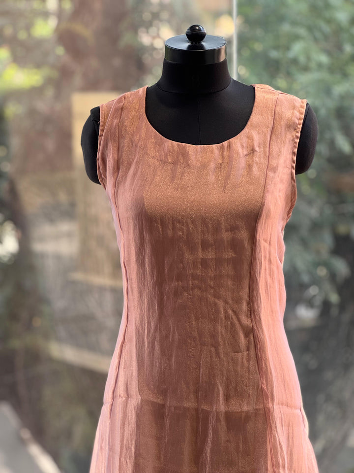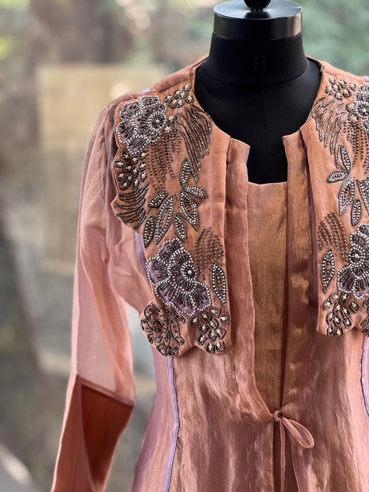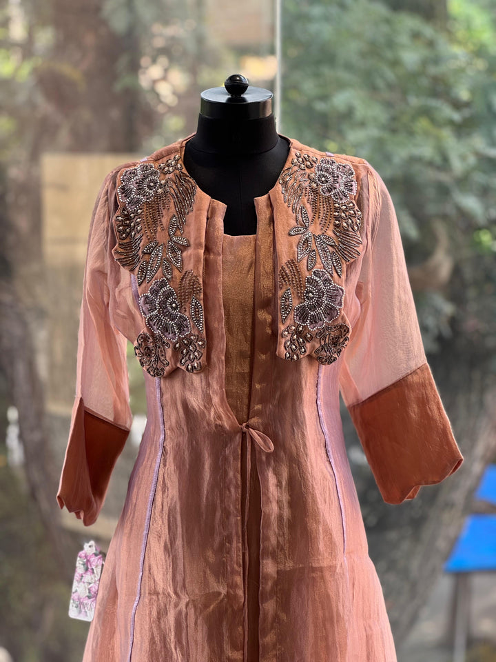 Pure glass tissue sleeveless inner with A line cut. Comes with intricate flap work long jacket with tie knot dori.
