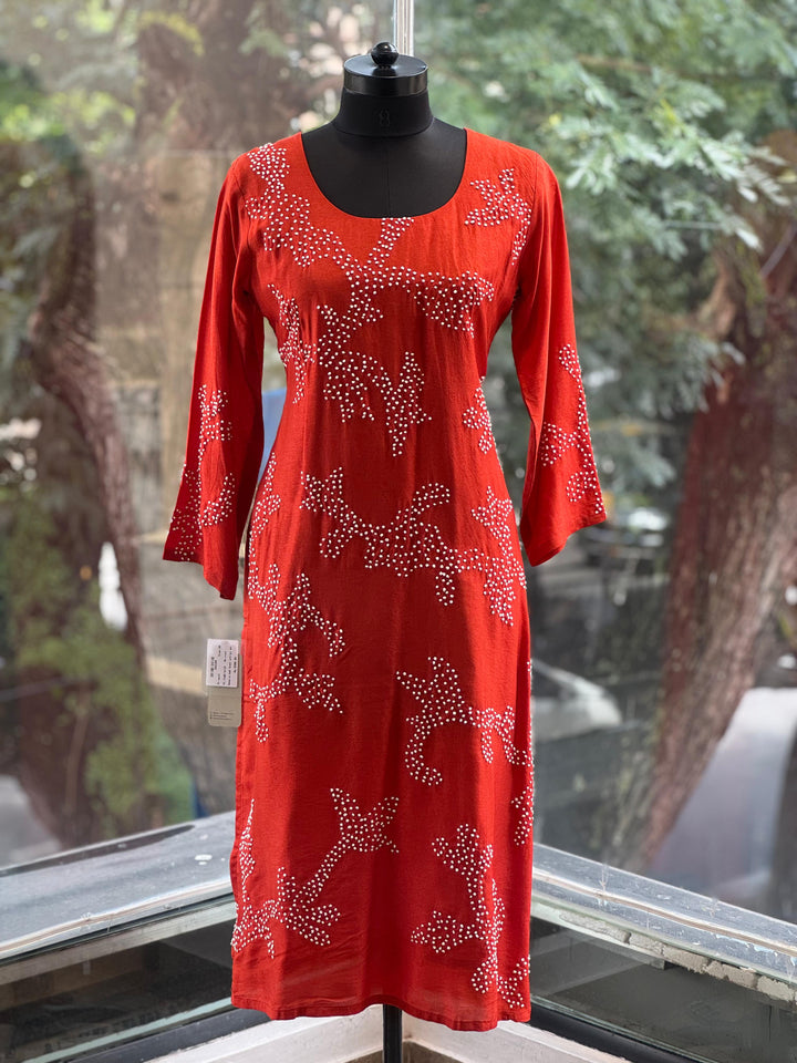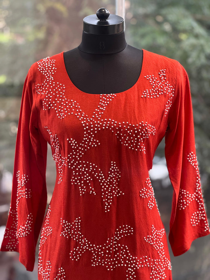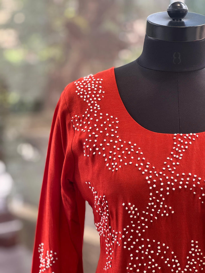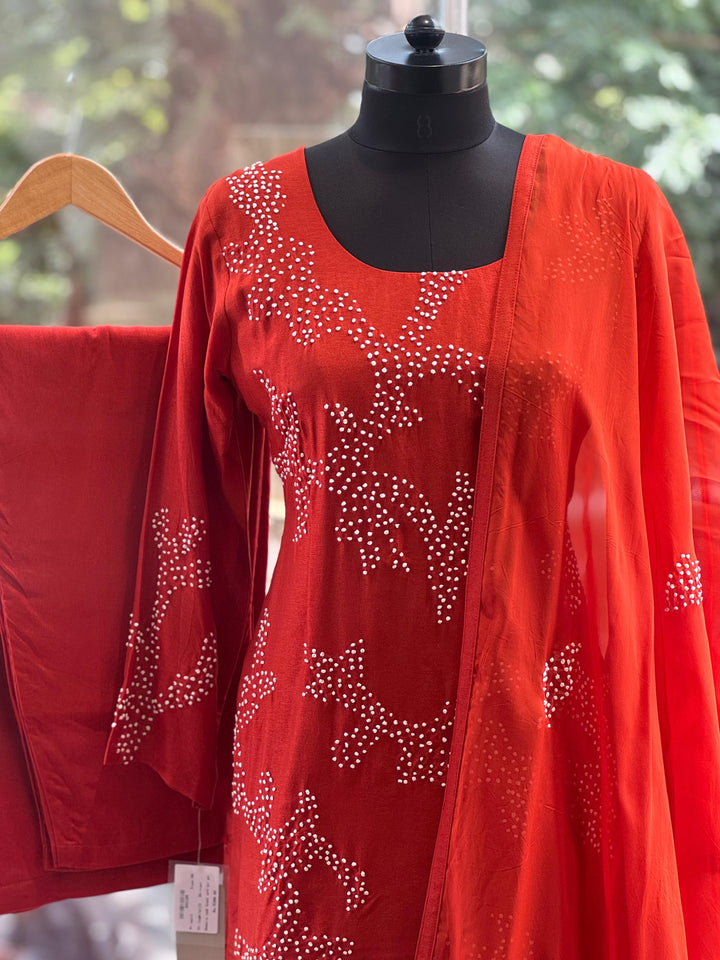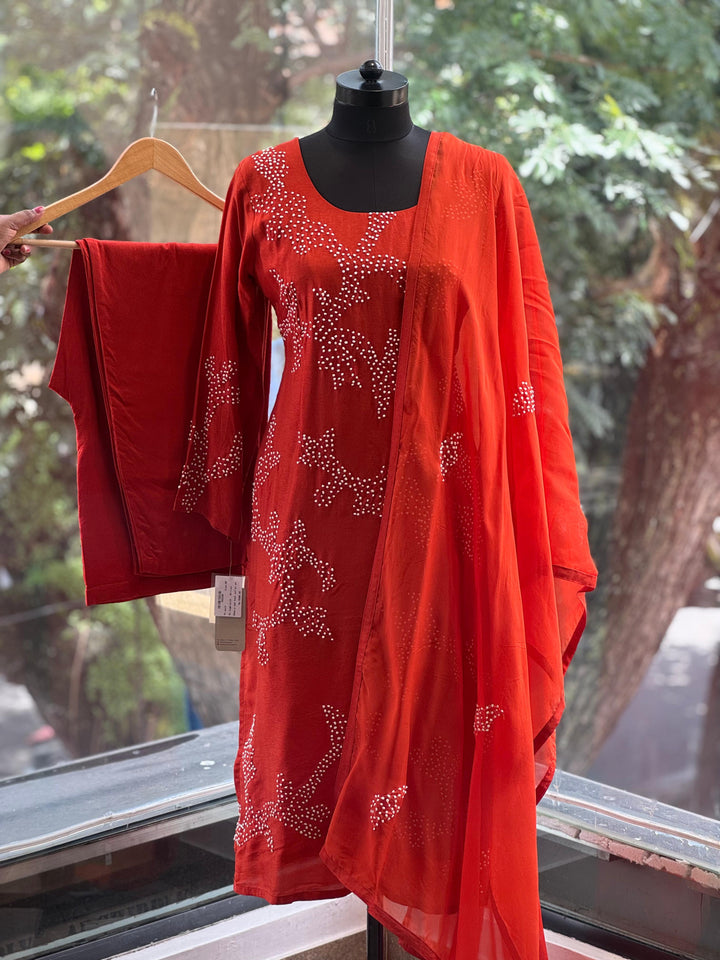 Pure silk hand knot work suit with comfort fit pants & soft organza dupatta.