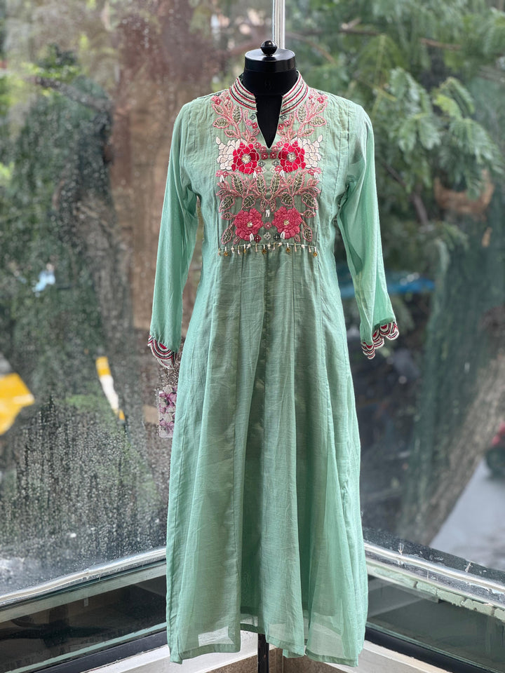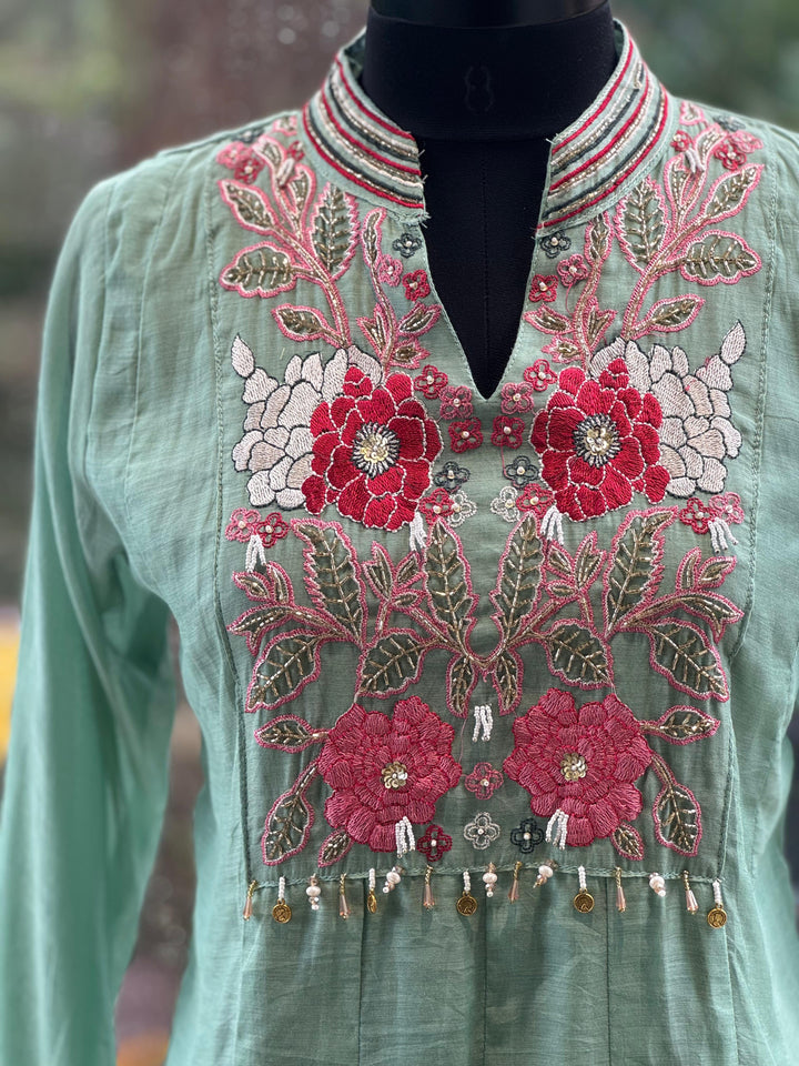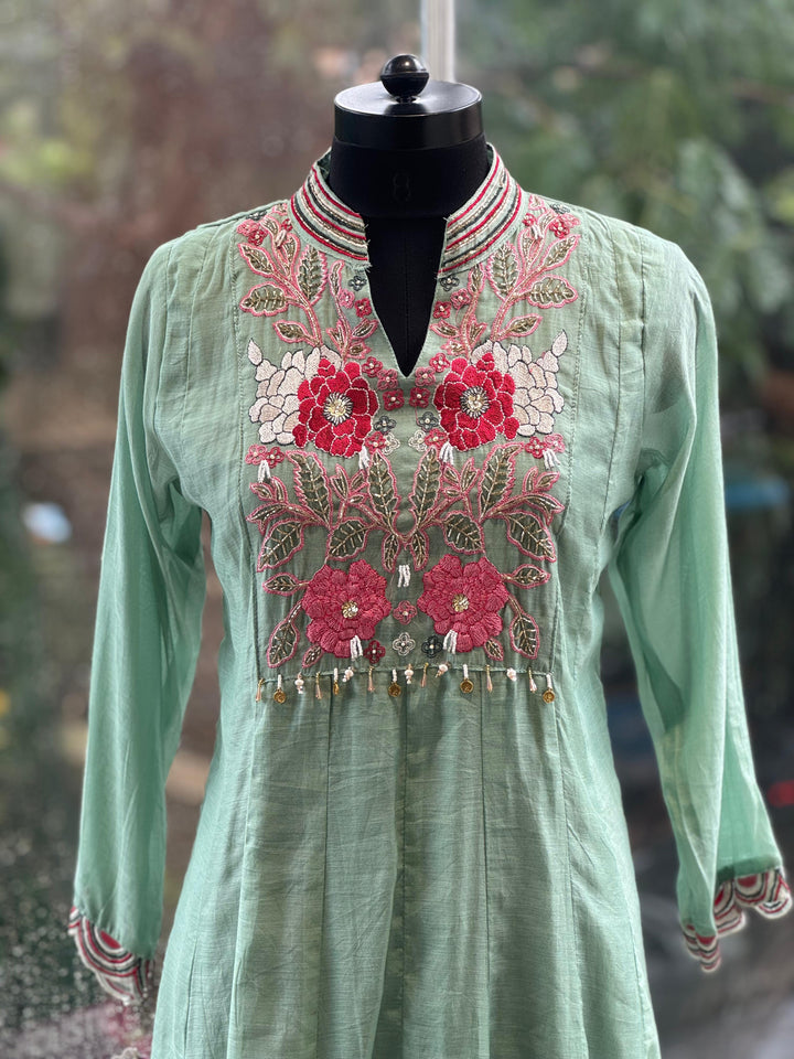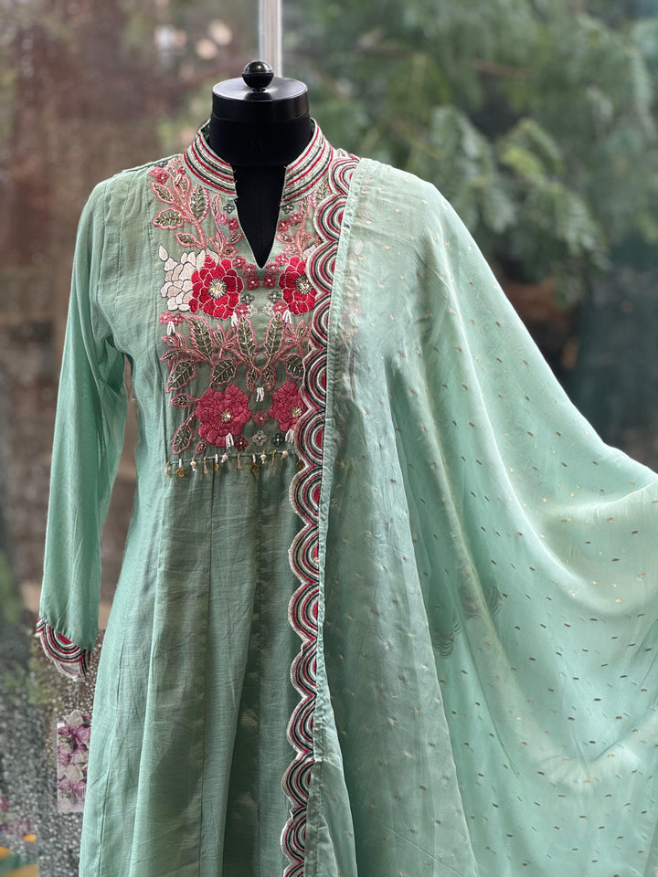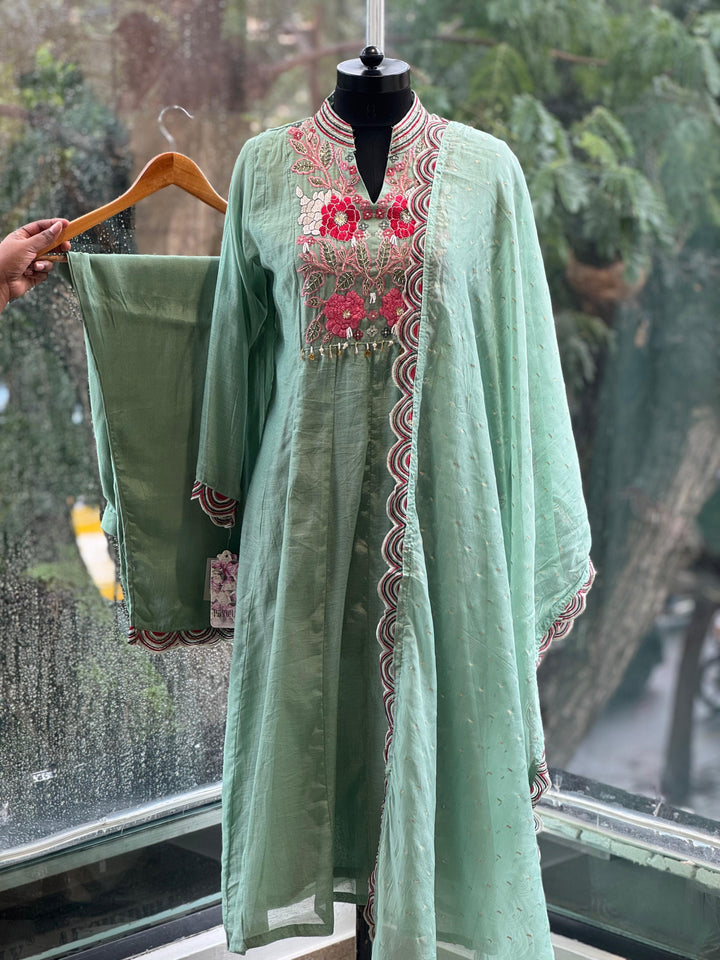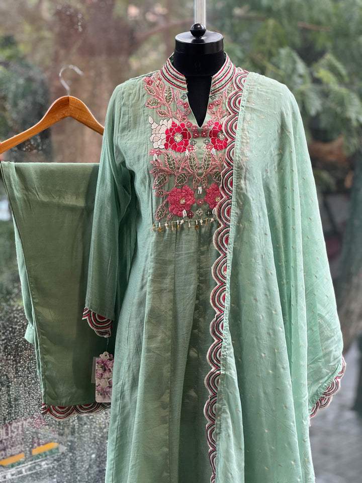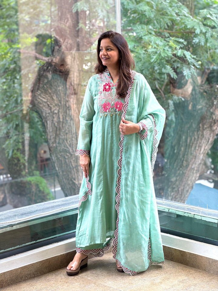 Pure mul chanderi embroidered yolk kurta with comfort fit pants and scallop embroidered dupatta.