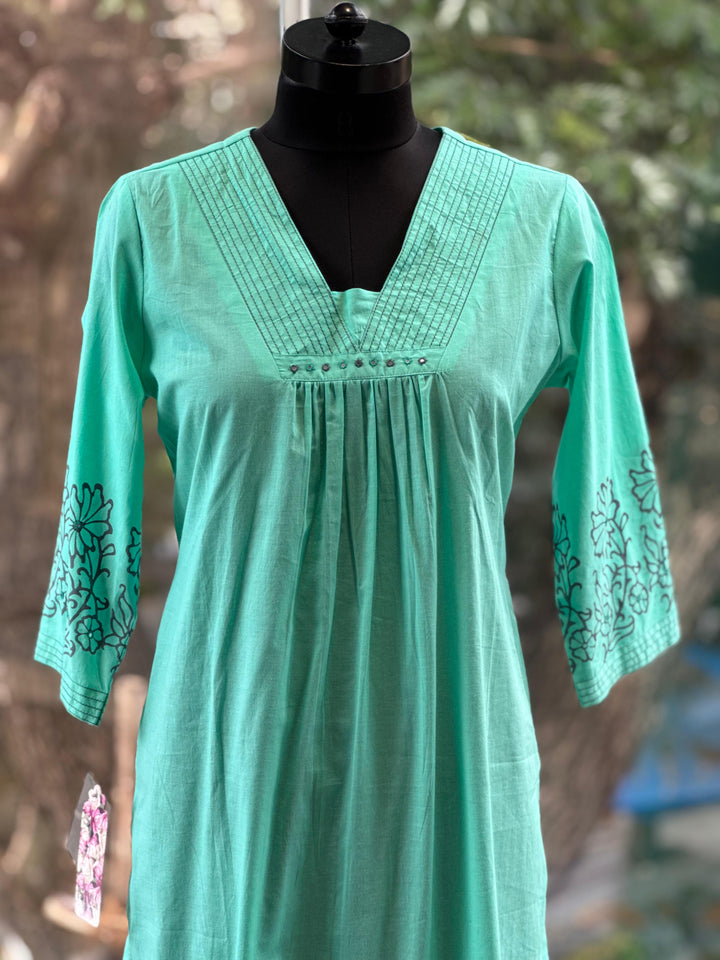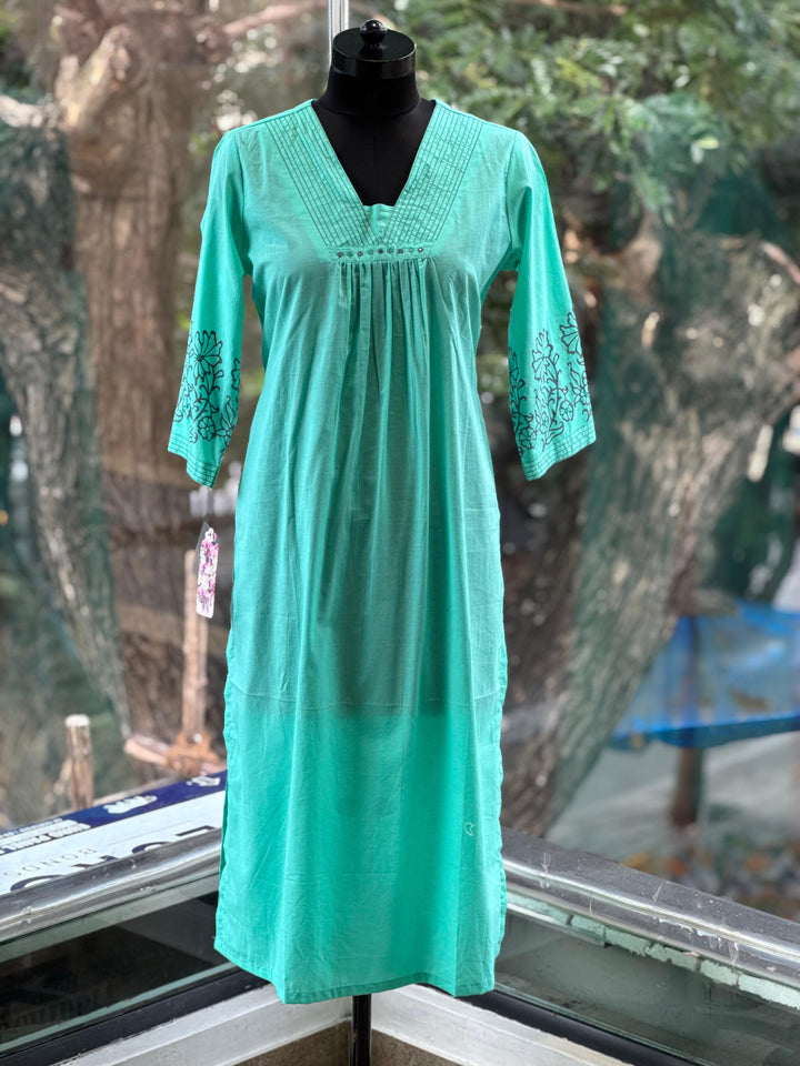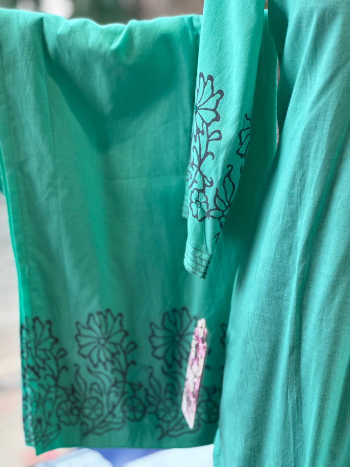 Pure mul cotton hand painted kurta with comfort fit pants and digital printed mul dupatta.