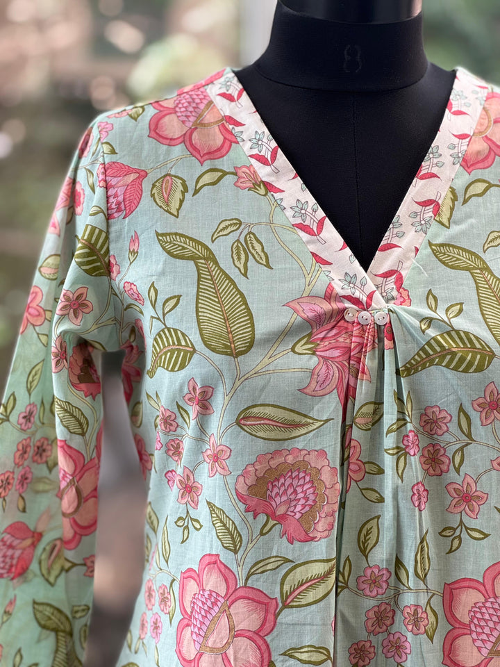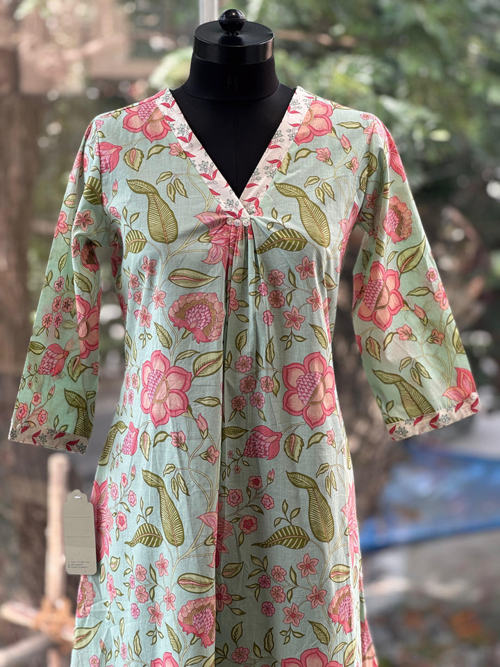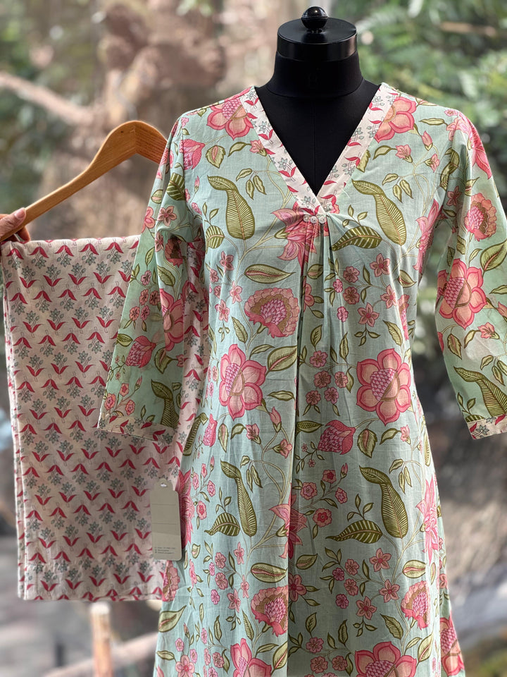 Pure cotton v neck floral kurta with printed comfort fit pants.
