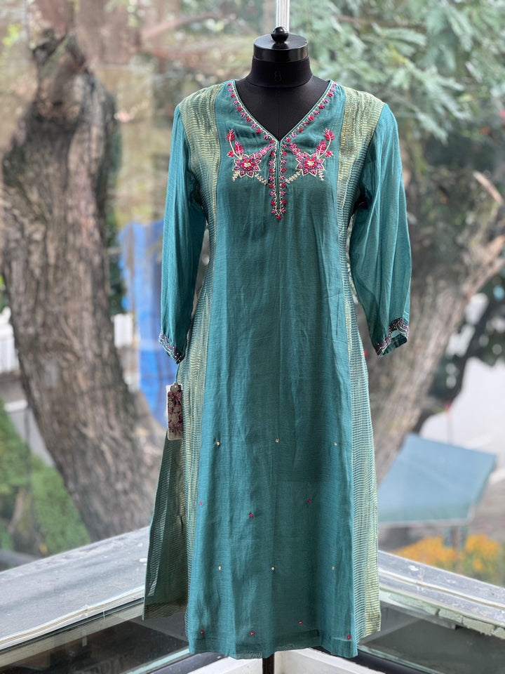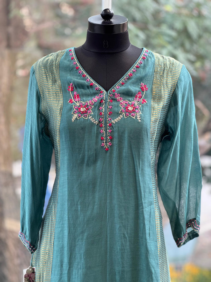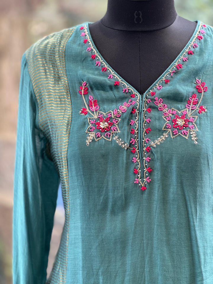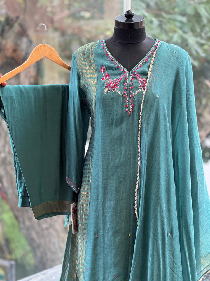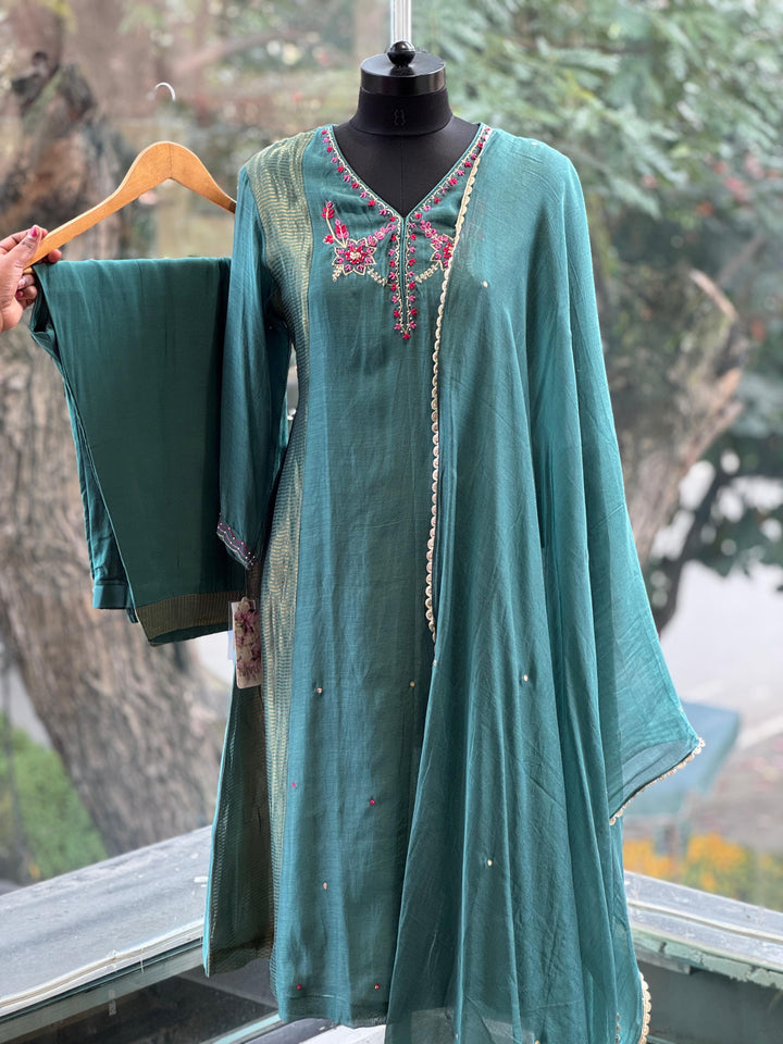 Pure Sea Green Tissue Suit V neck hand emboridary comes with comfort pant and nice dupatta.