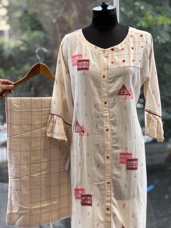 Off white soft cotton self weaving kanta work kurta with straight wide leg comfort pants.