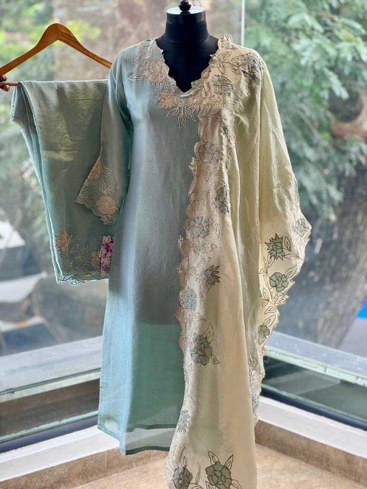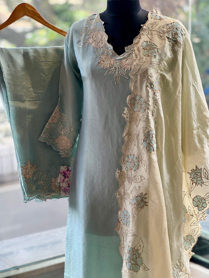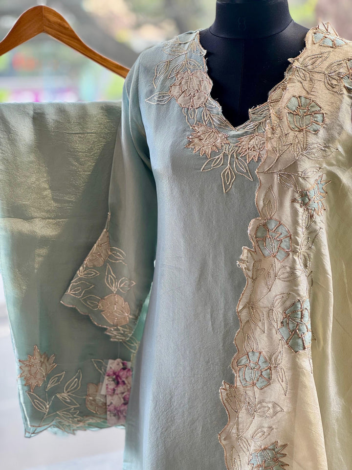 Pure tissue straight cut kurta with gota work detailing...comes with tissue contrast dupatta and comfort fit pants.