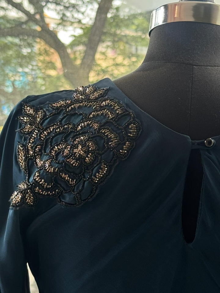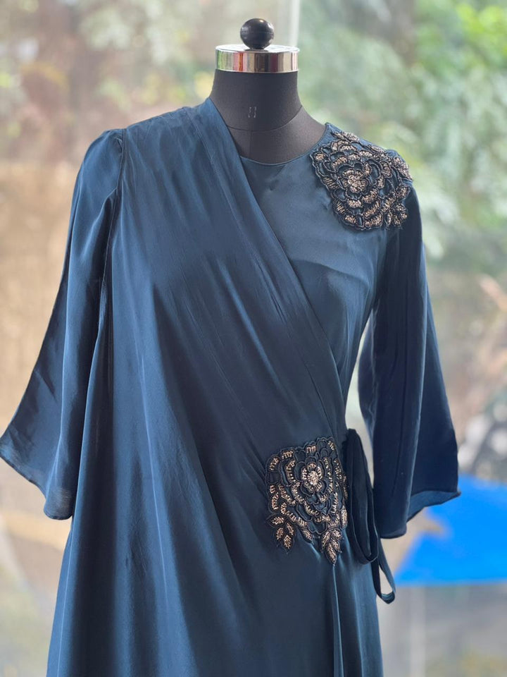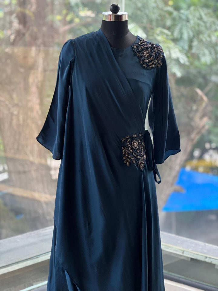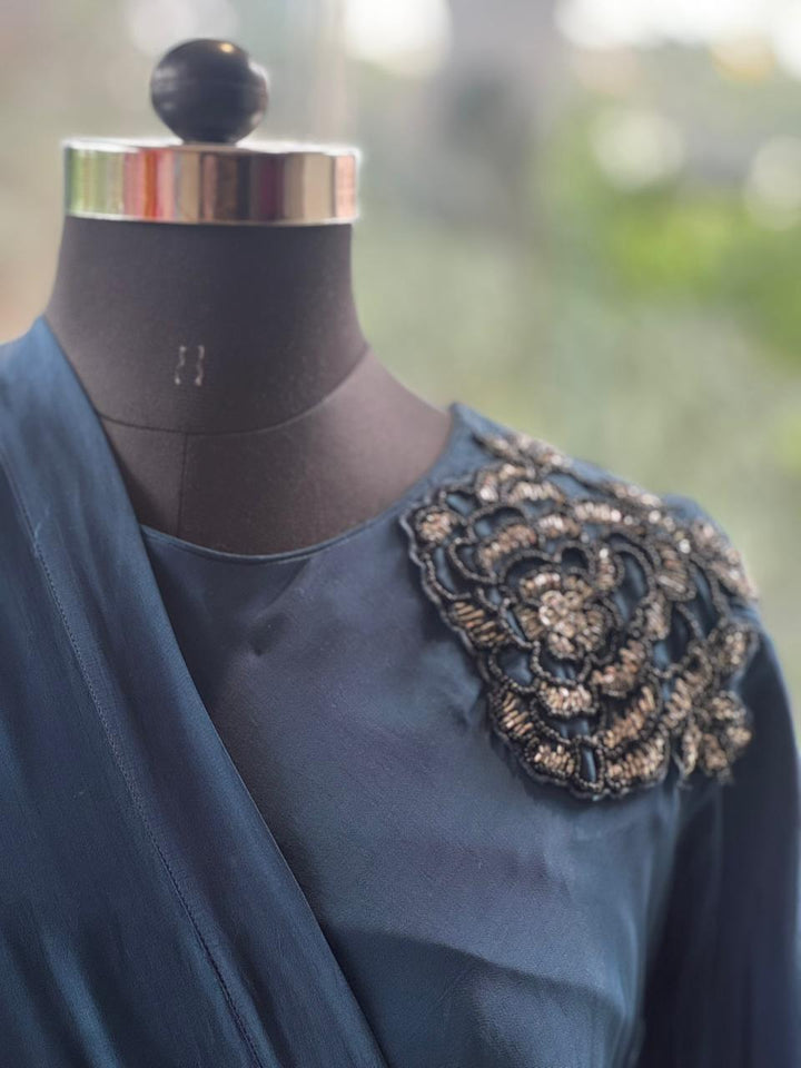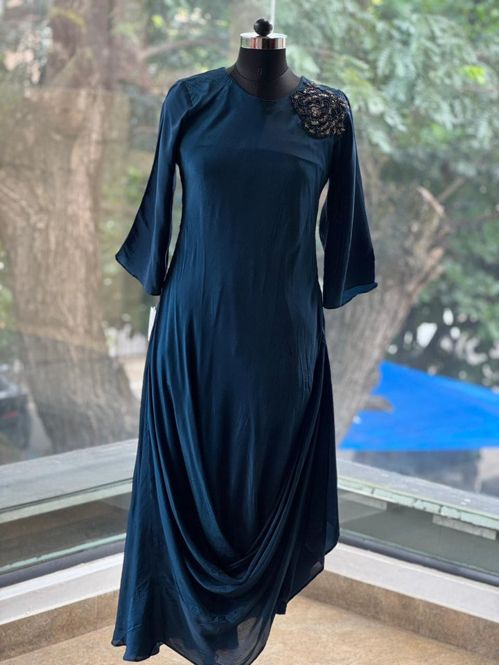 Pure satin silk intricate work on 1 side shoulder with side cowl flap gown.
