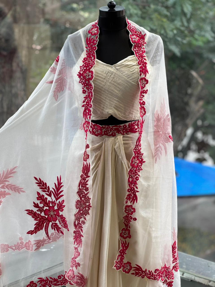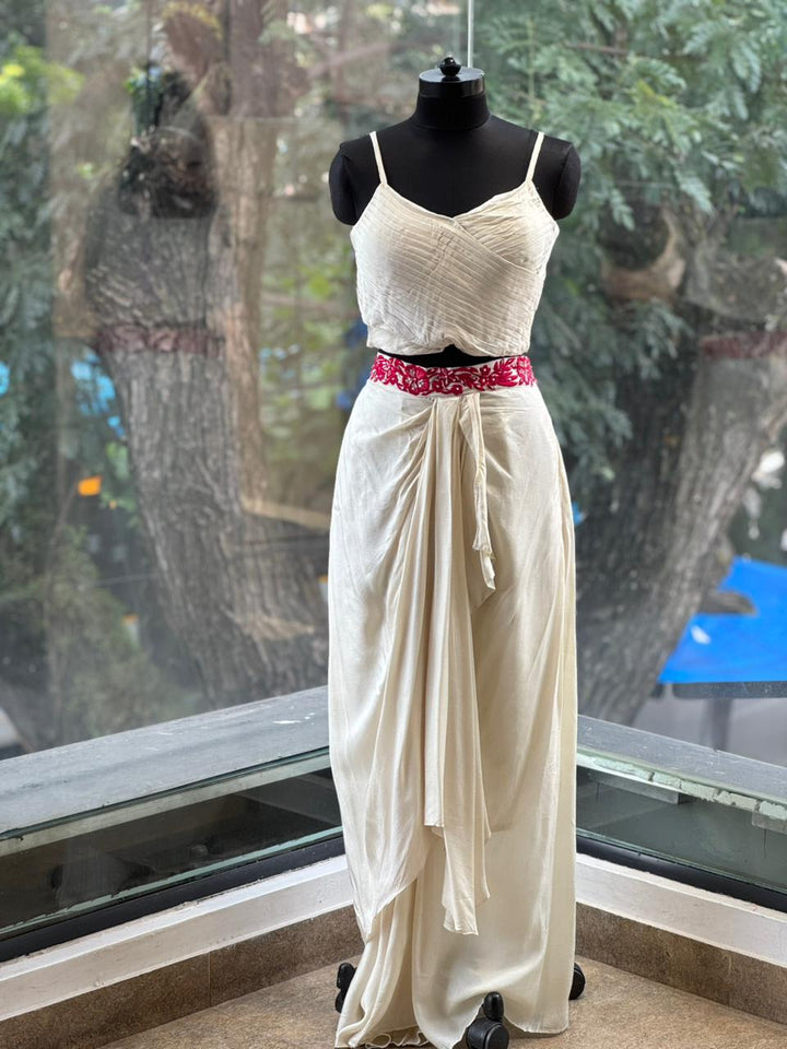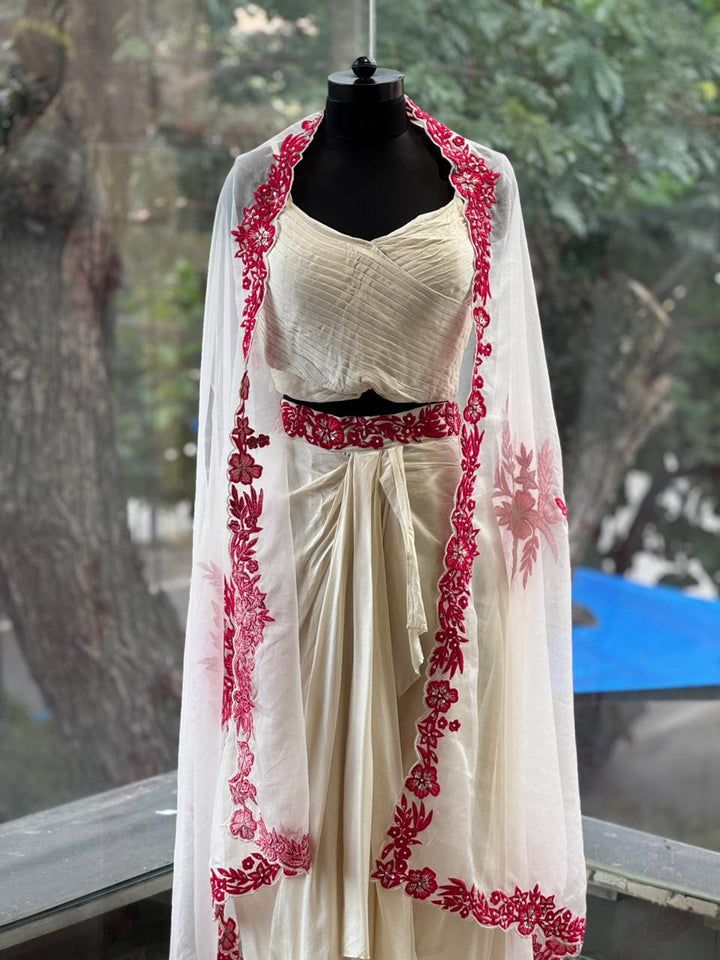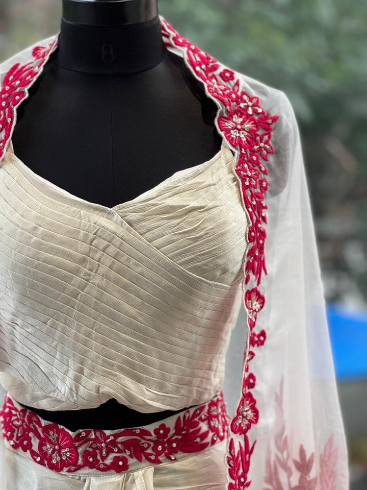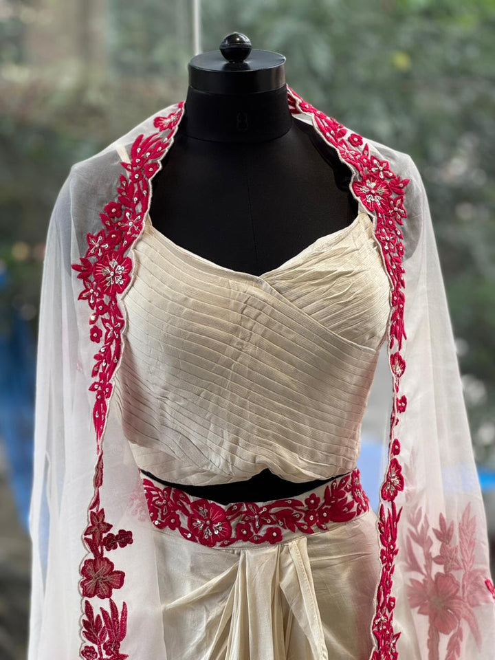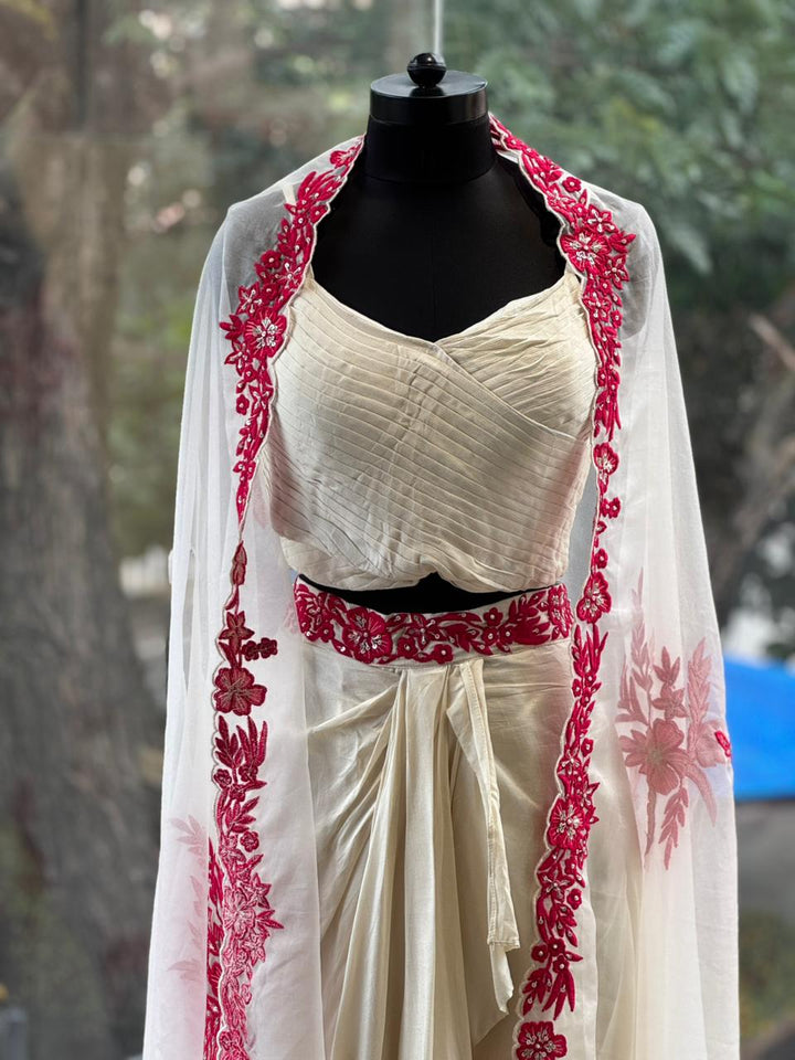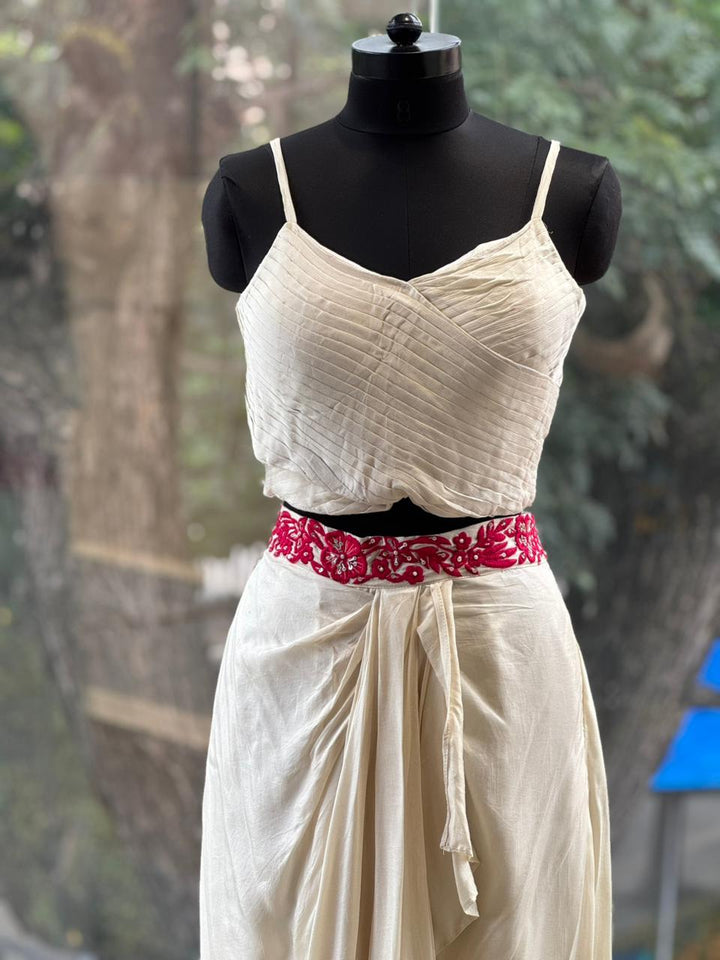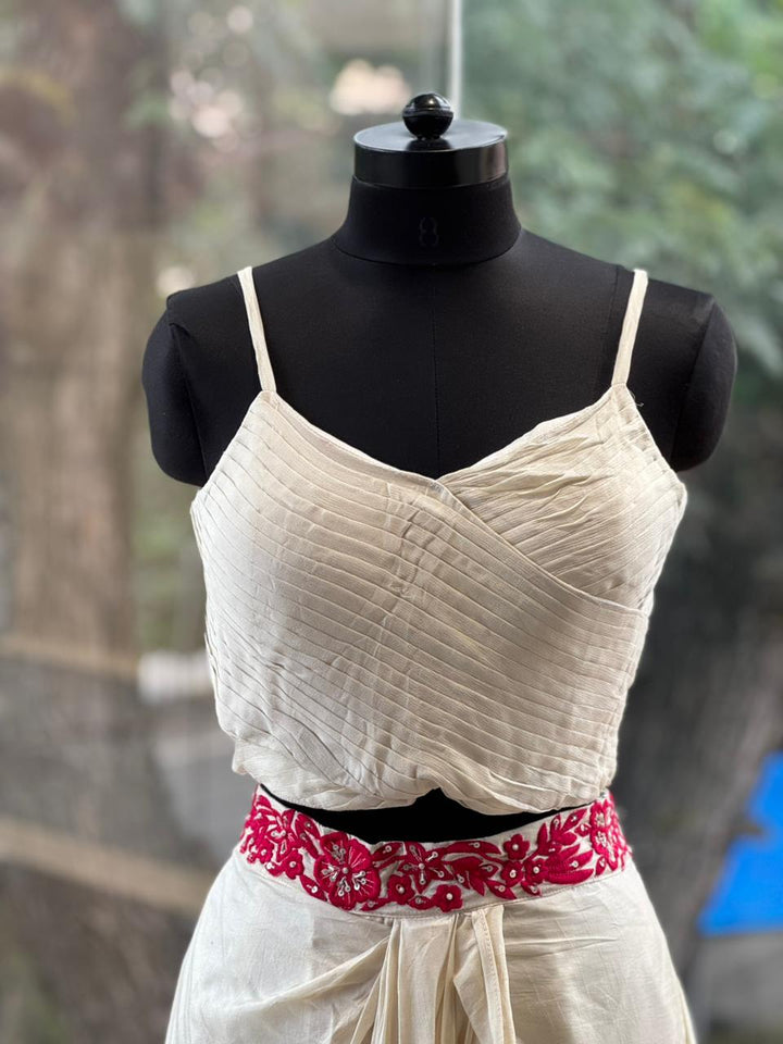 Pure silk sphaghetti pleated short inner with silk front pleated skirt with attached waist belt work. Comes with soft silk organza cape with embroidery.