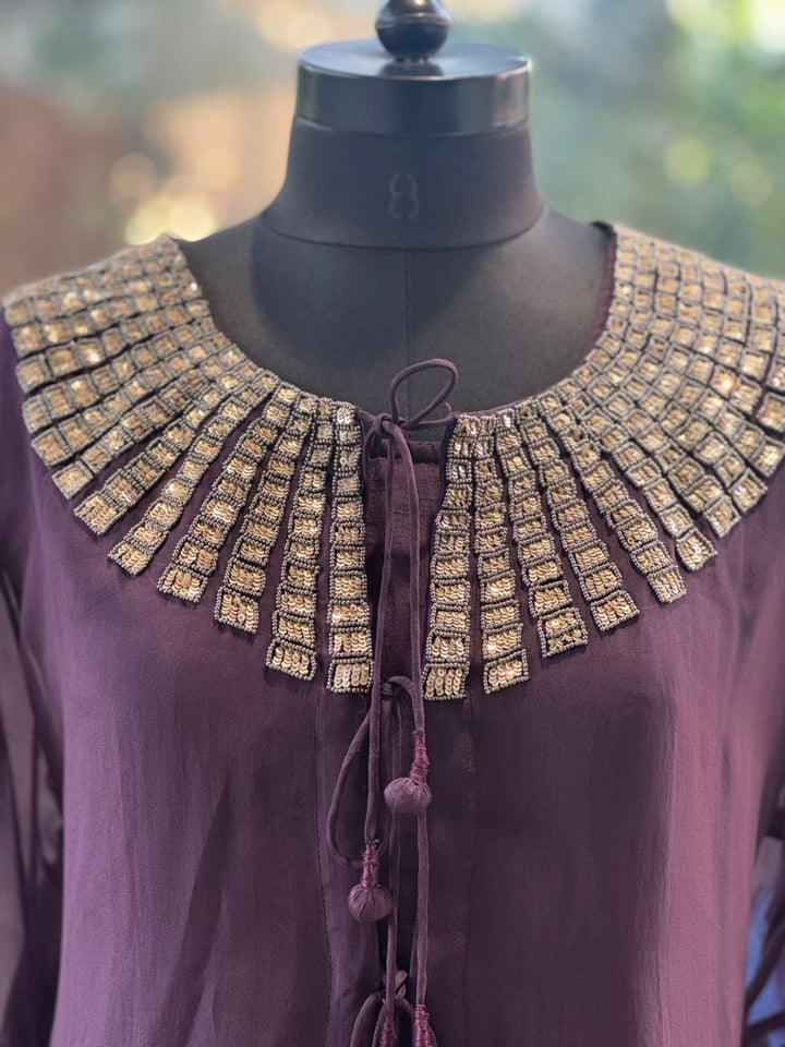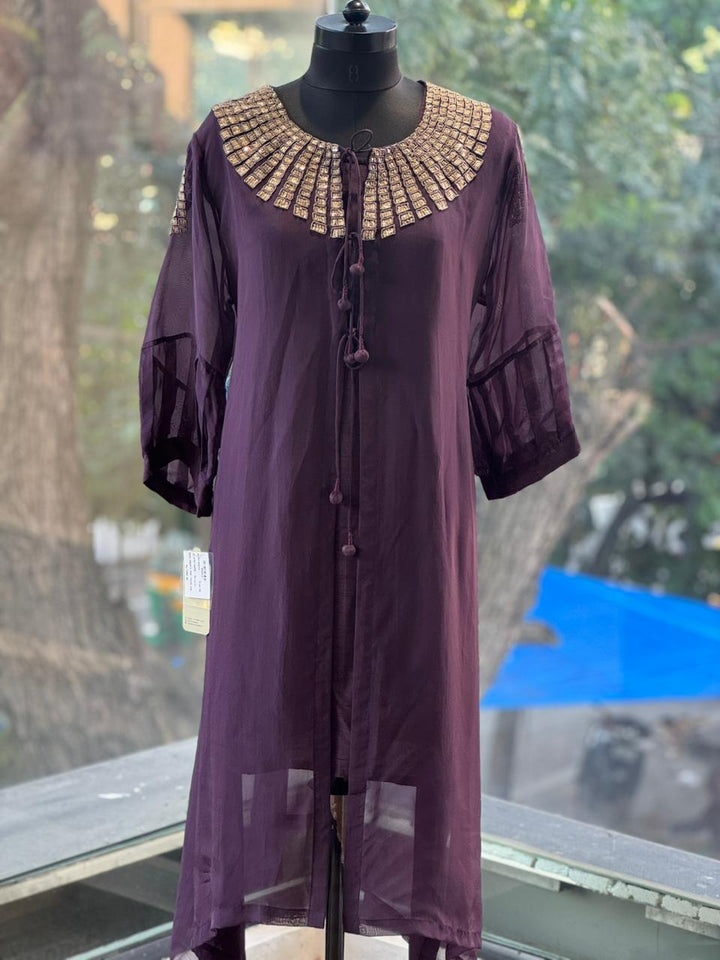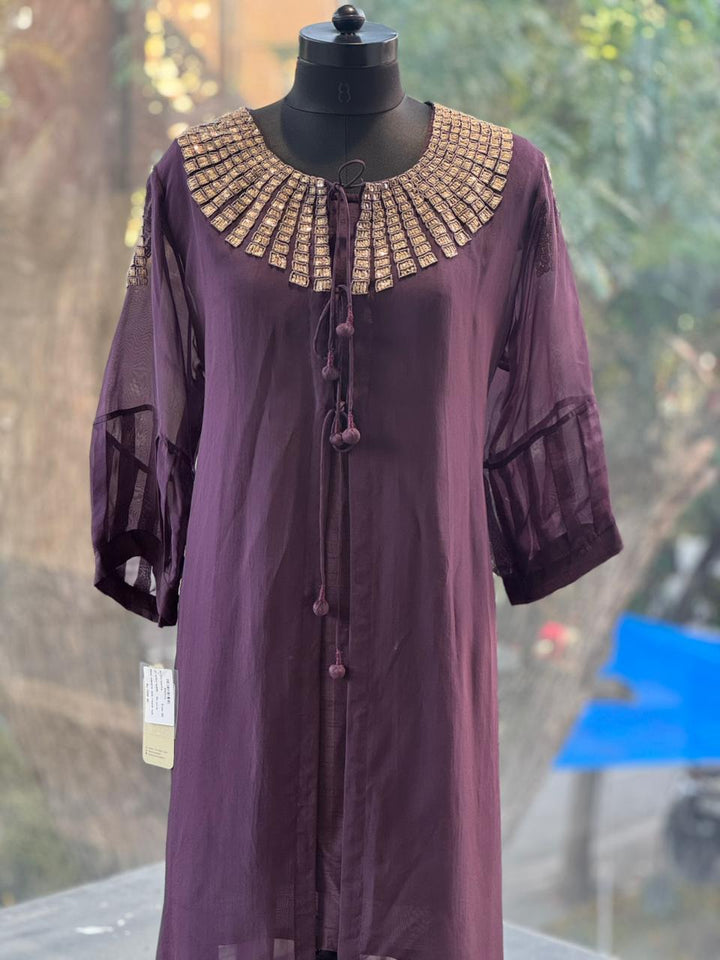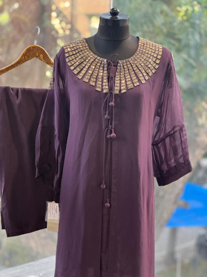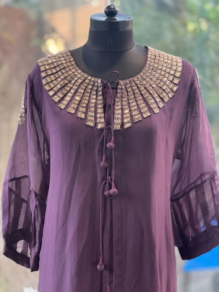 Plain silk short inner with same color pants,comes with soft silk organza stylish tunic with heavy yolk work.