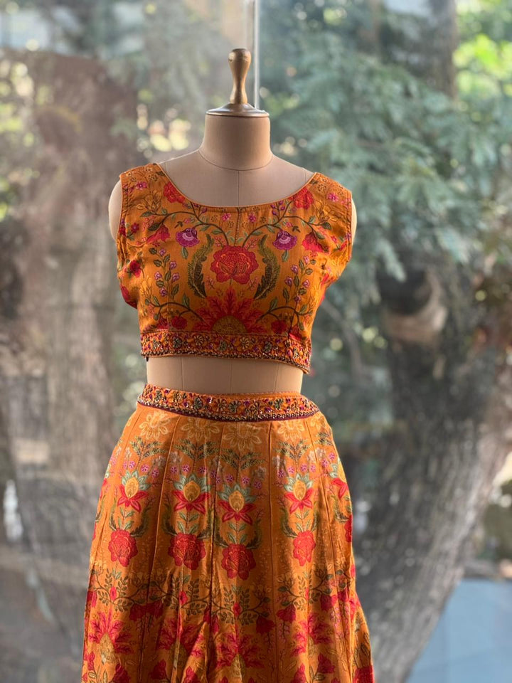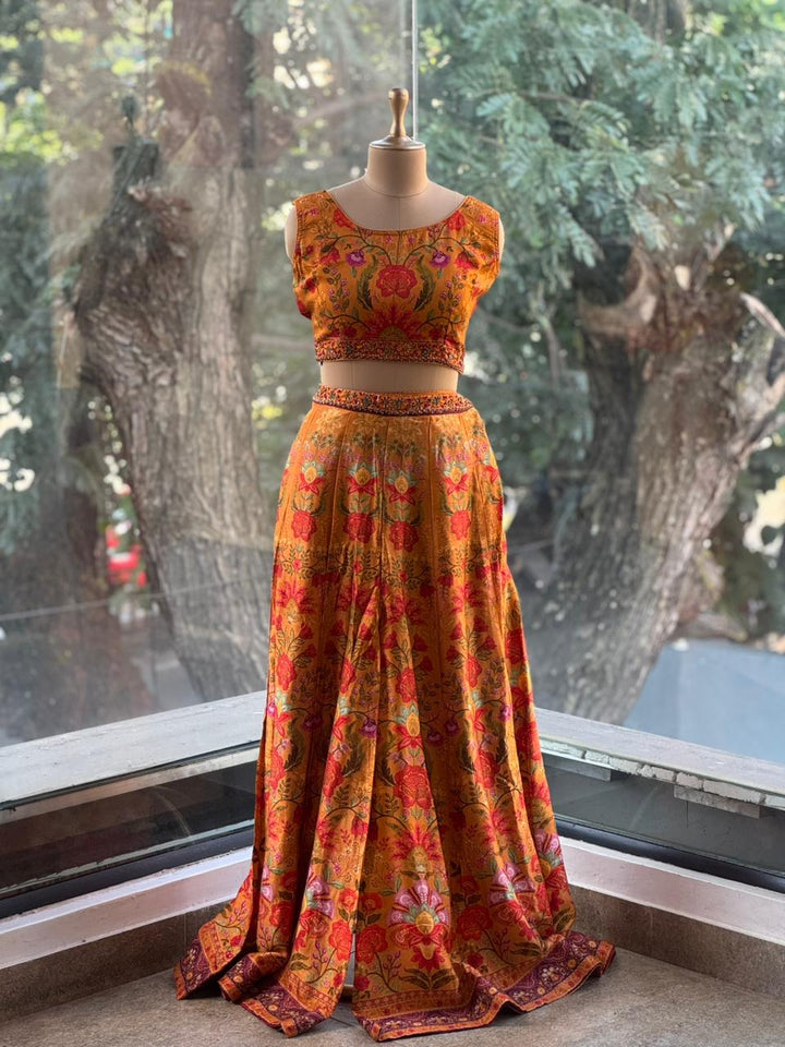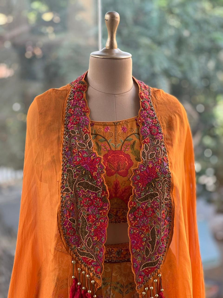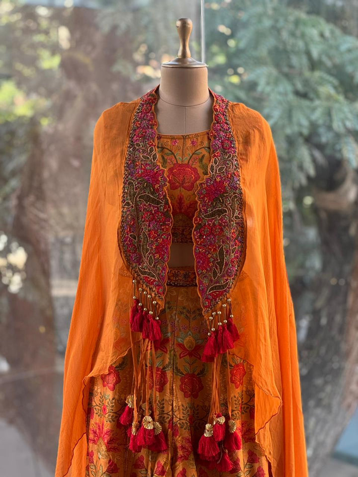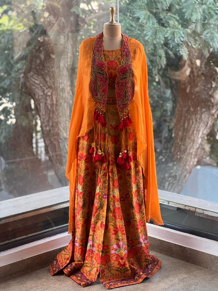 Pure soft silk digital print sleeveless top with wide leg pants and a beautiful cape with intricate work on yolk and tassle detailling.