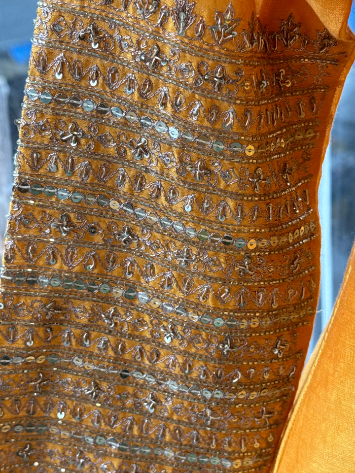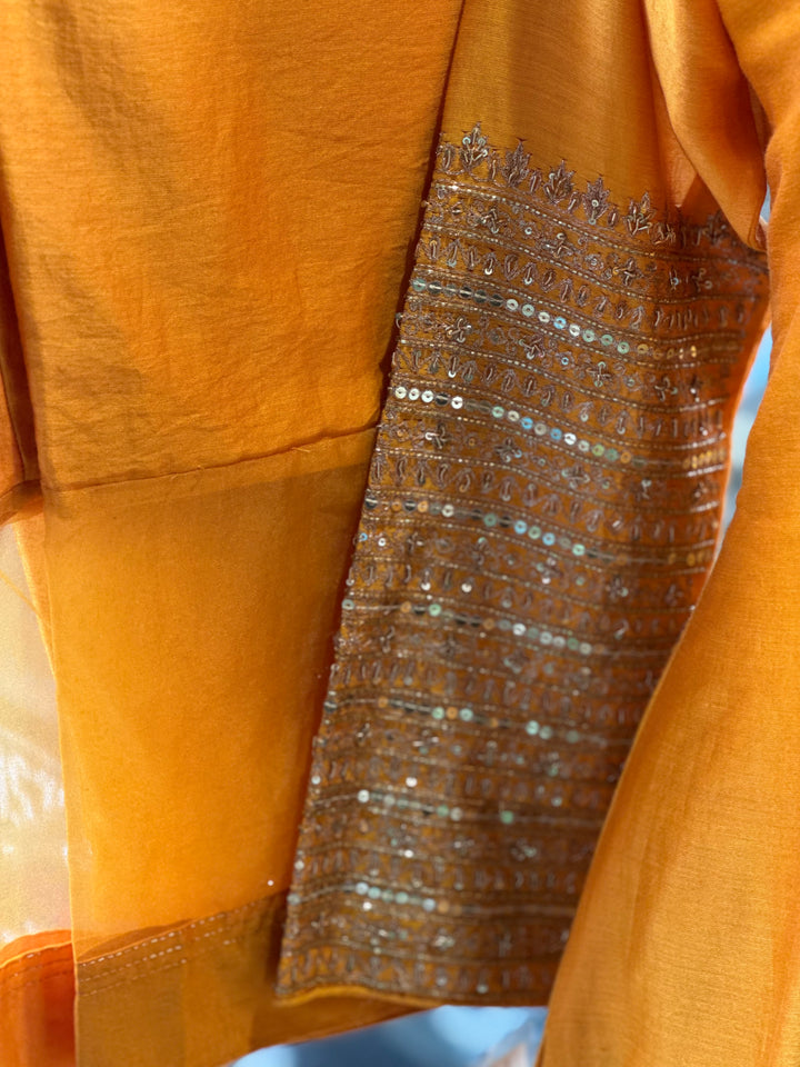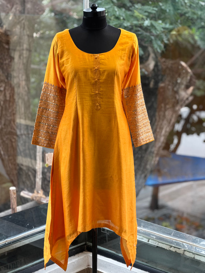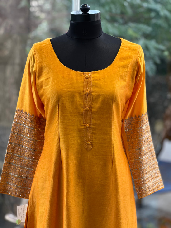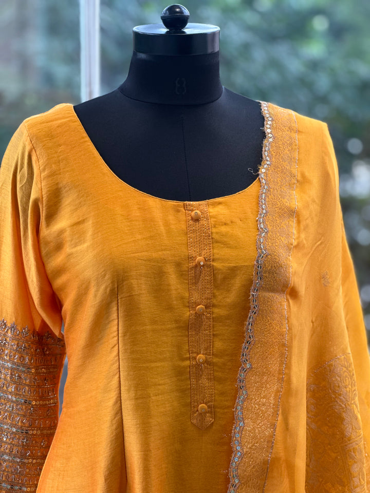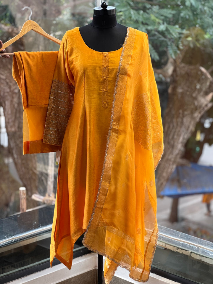 Pure Chanderi silk plain asymmetrical kurta with beautiful hand work on sleeves and plain straight comfort fit pants and Banarasi dupatta.