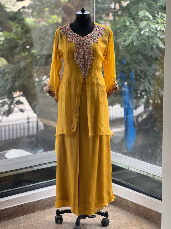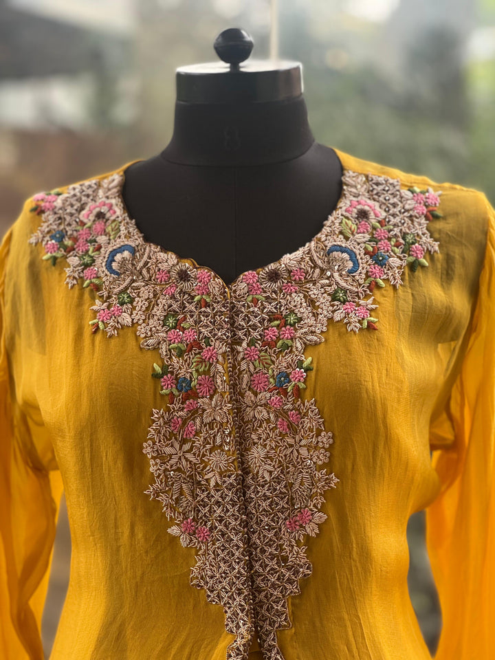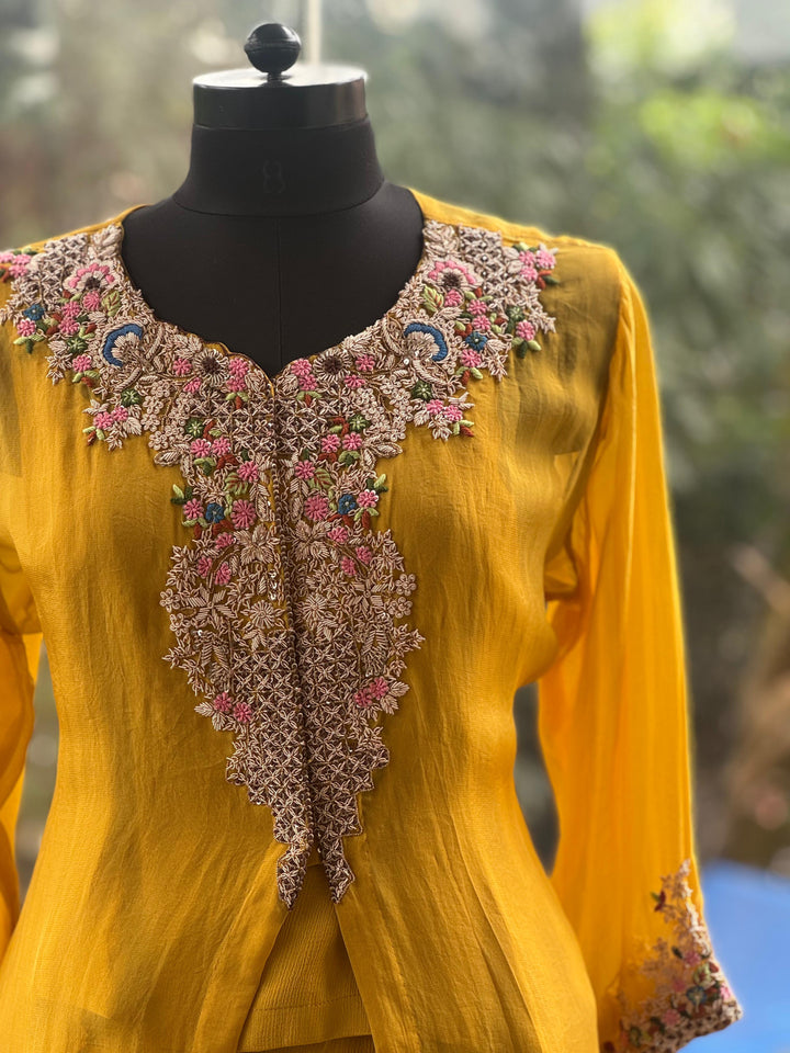 Pure soft organza silk intricate hand embroidered kurta with sleeveless inner. Comes with wide leg pants.
