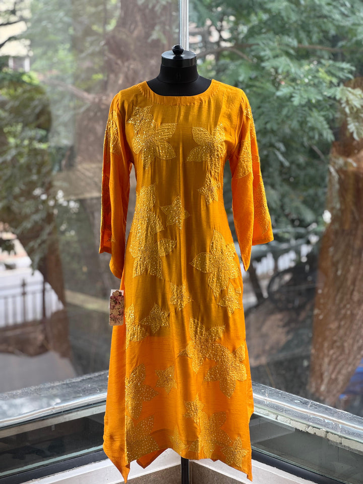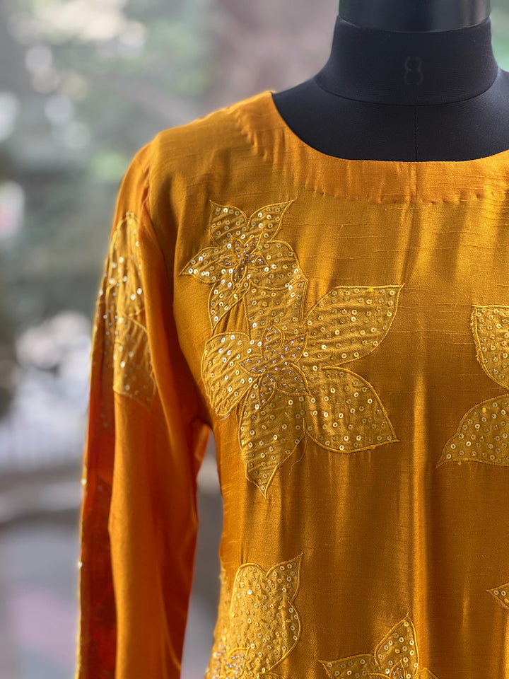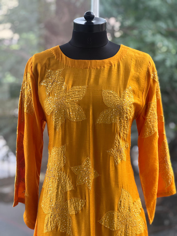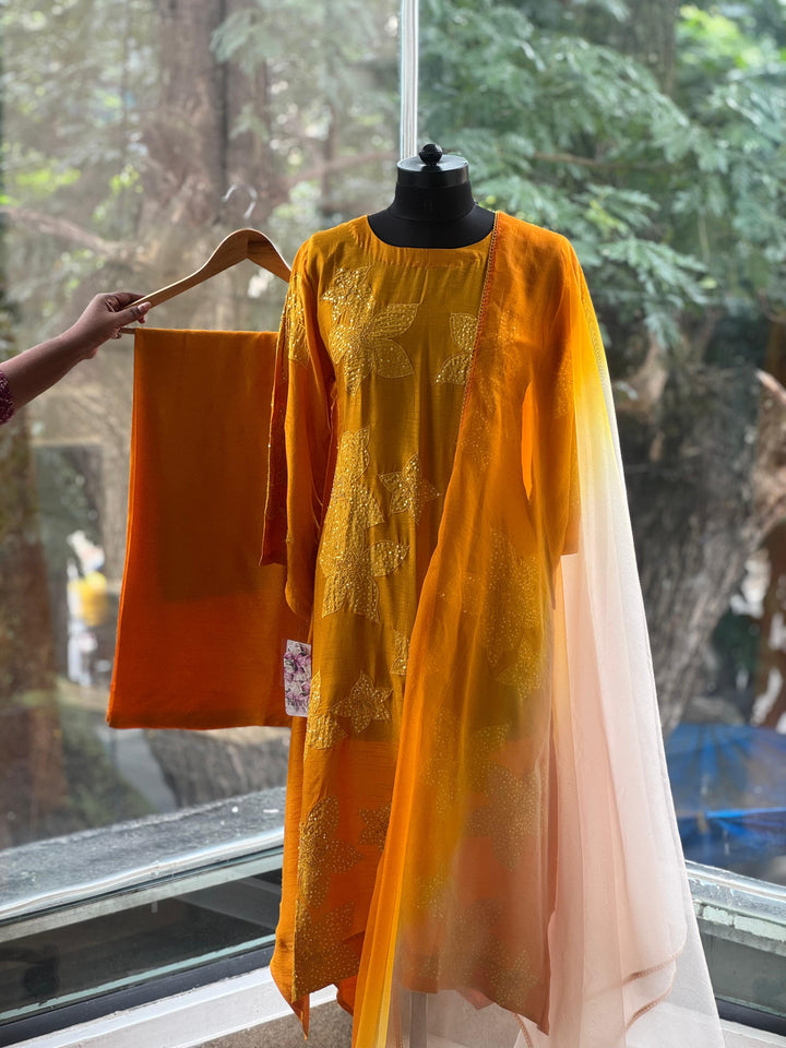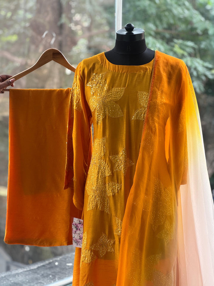 Pure silk flower patch work asymmetrical kurta with plain straight comfort fit pants and shaded organza dupatta.