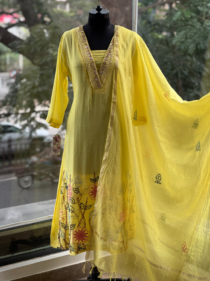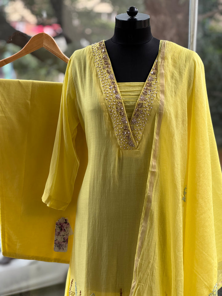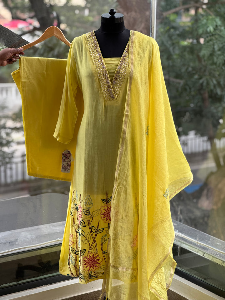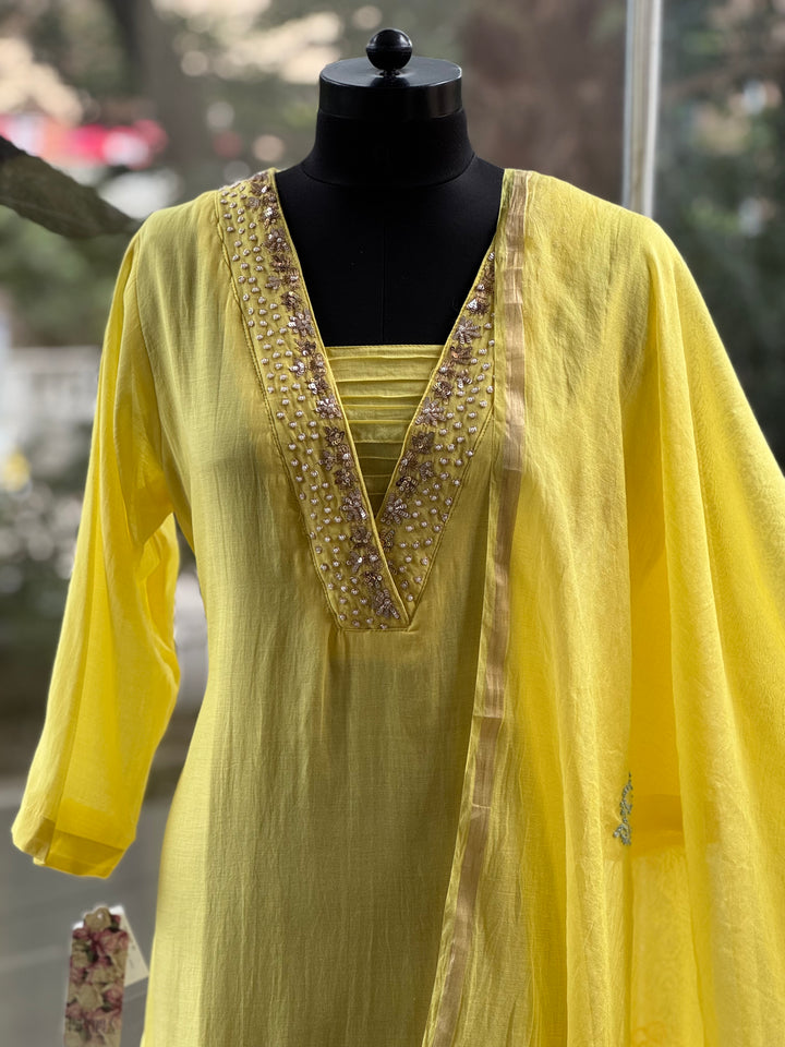 Pure mul chanderi v neck knot work kurta with comfort fit pants and soft dupatta.