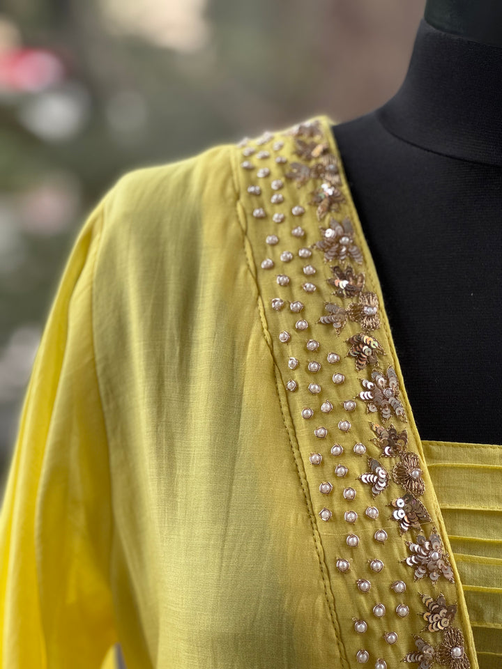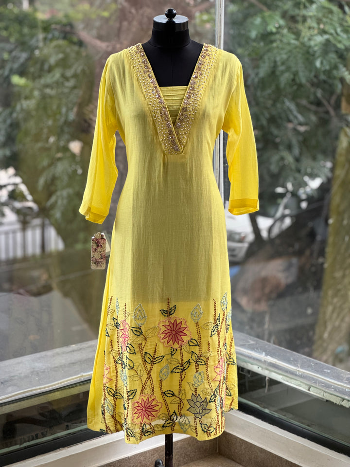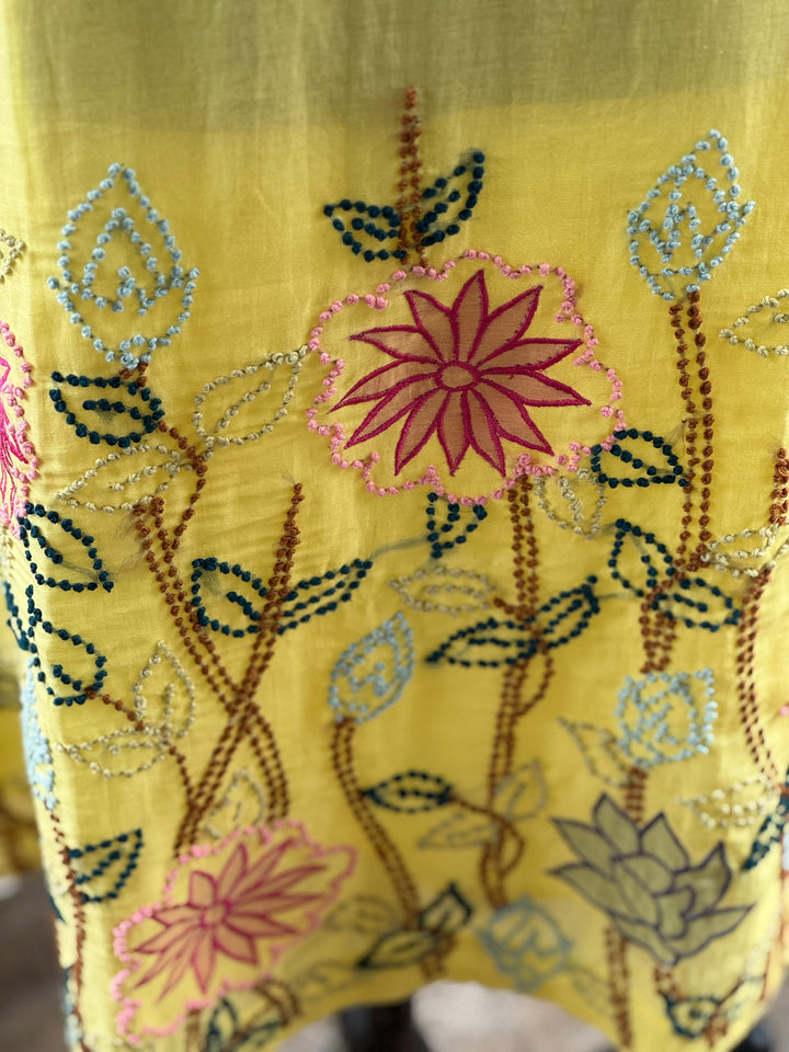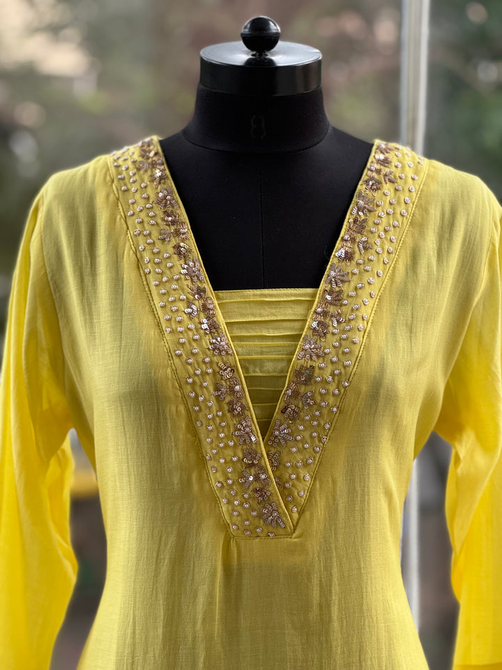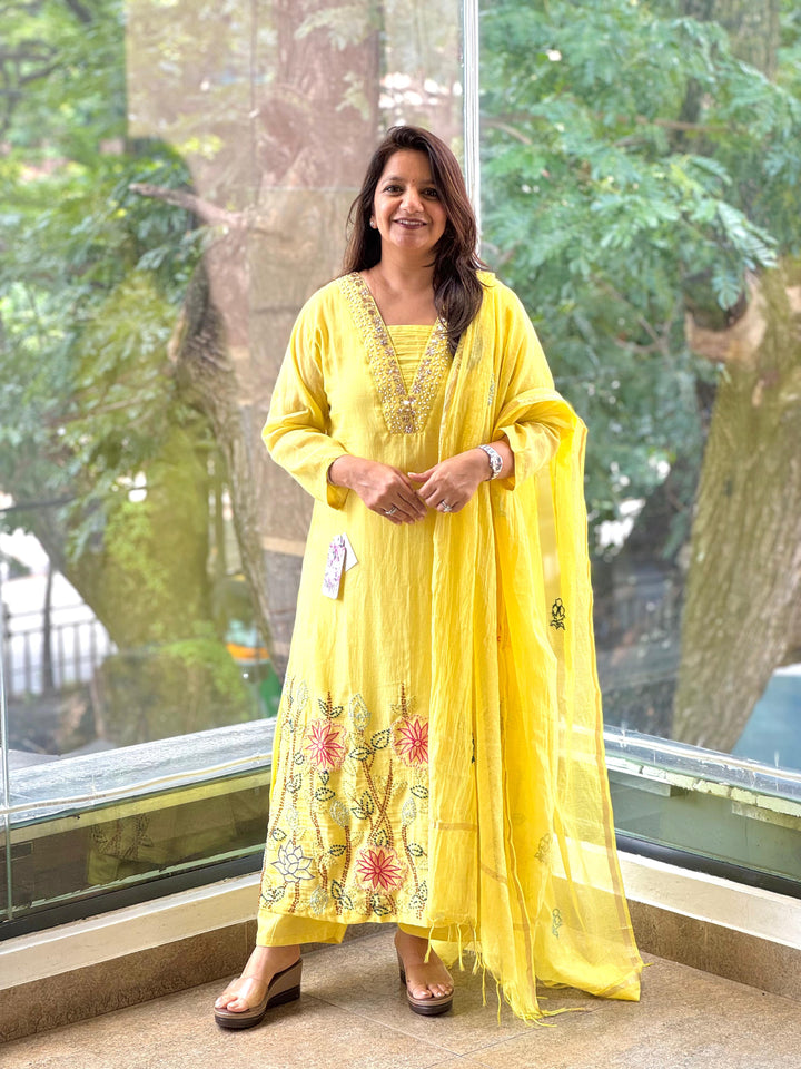 Pure mul chanderi v neck knot work kurta with comfort fit pants and soft dupatta.