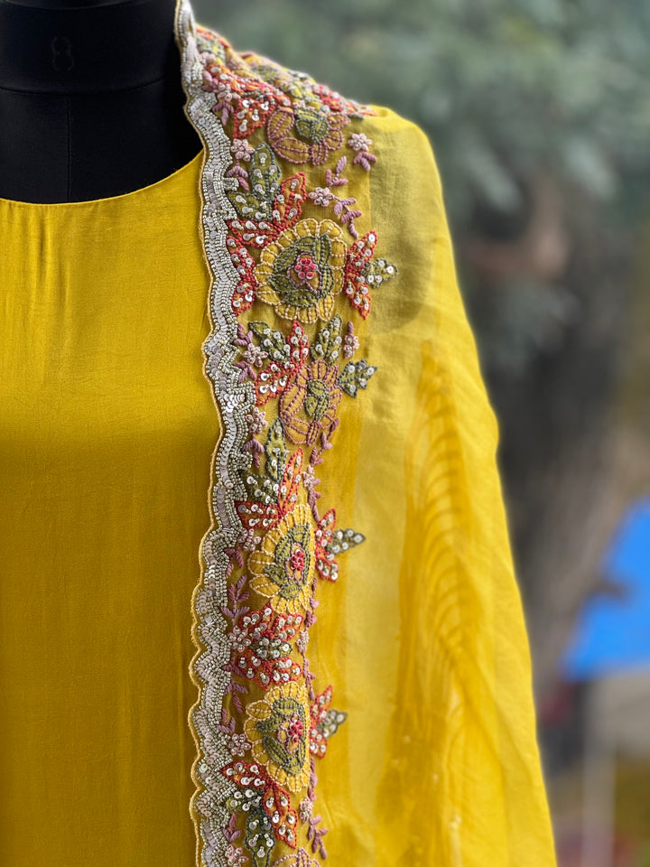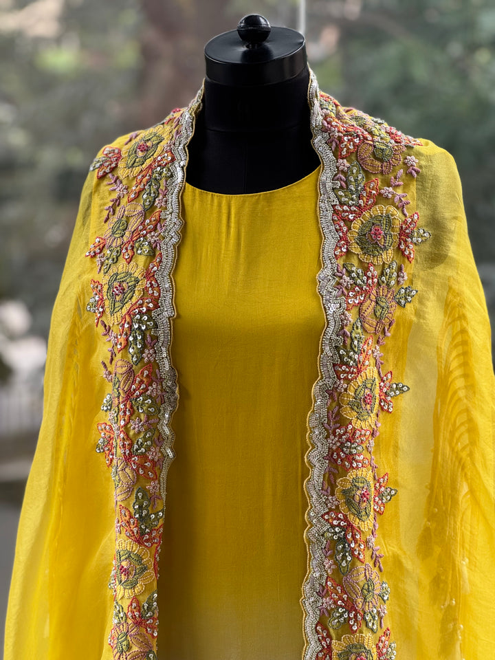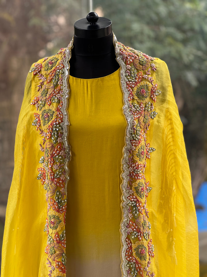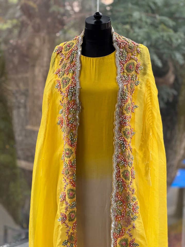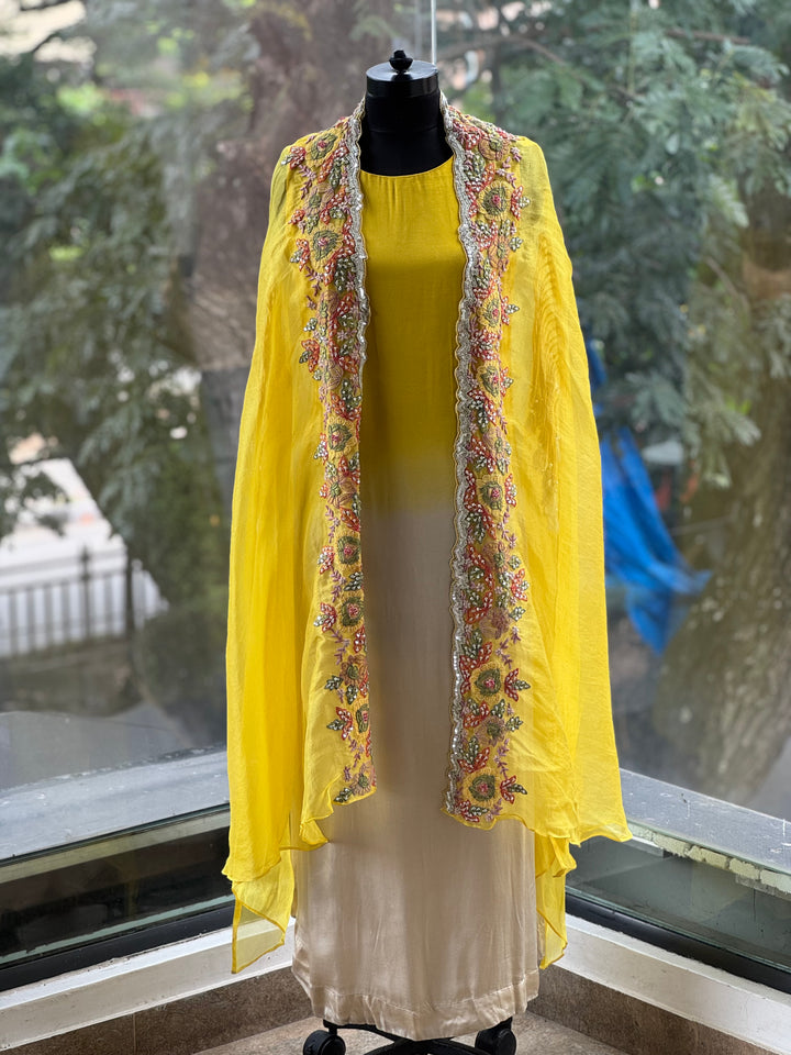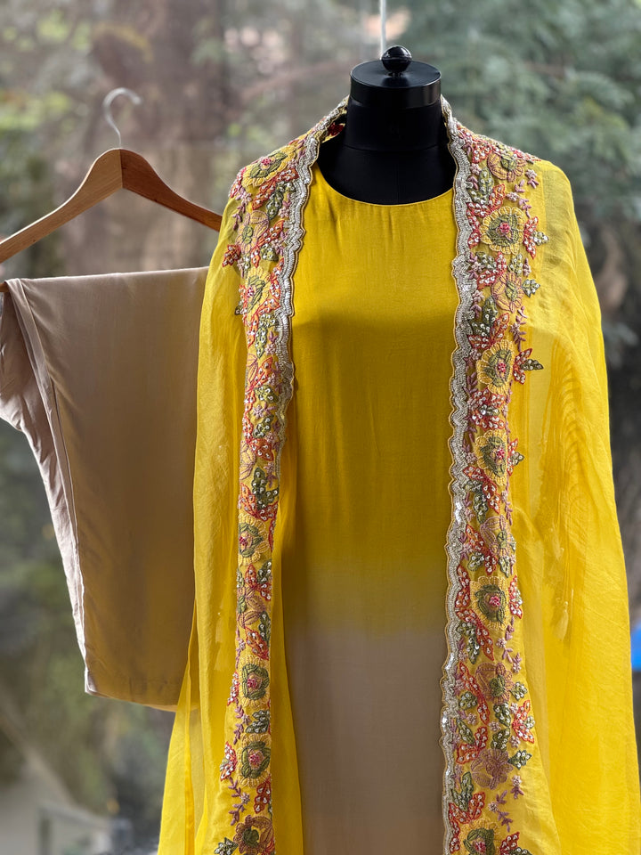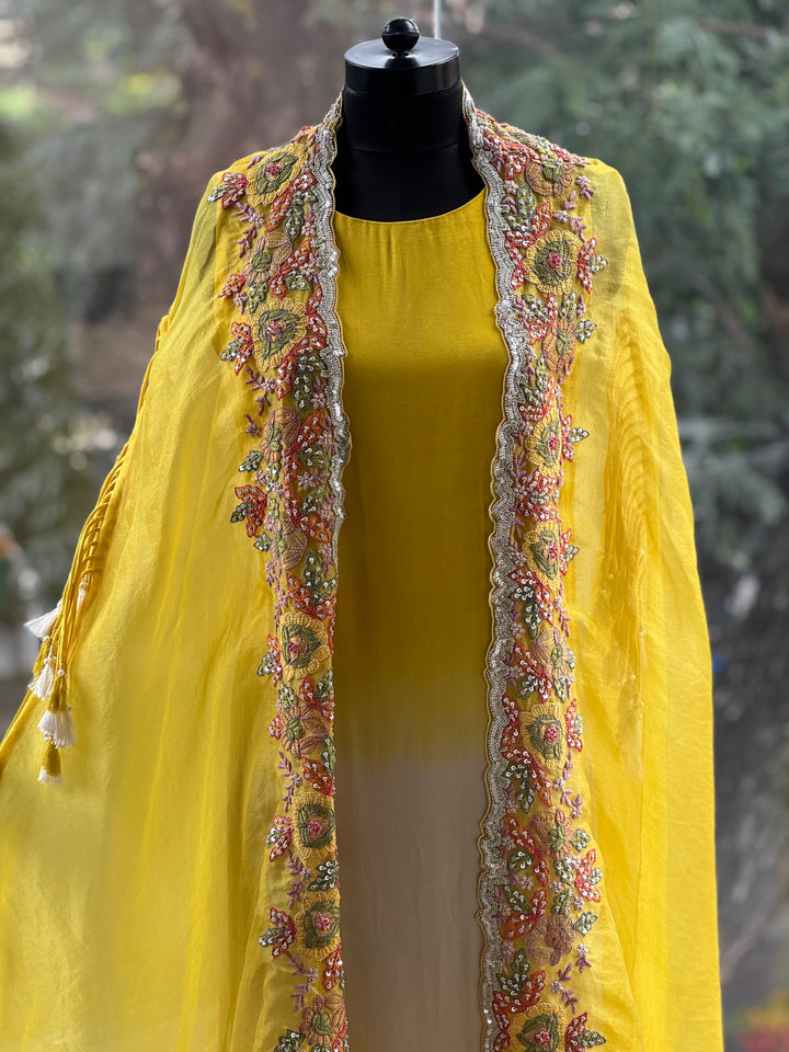 Pure soft silk shaded sleeveless tunic and pants with pure soft organza hand embroidered cape with tassels.