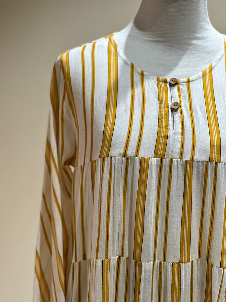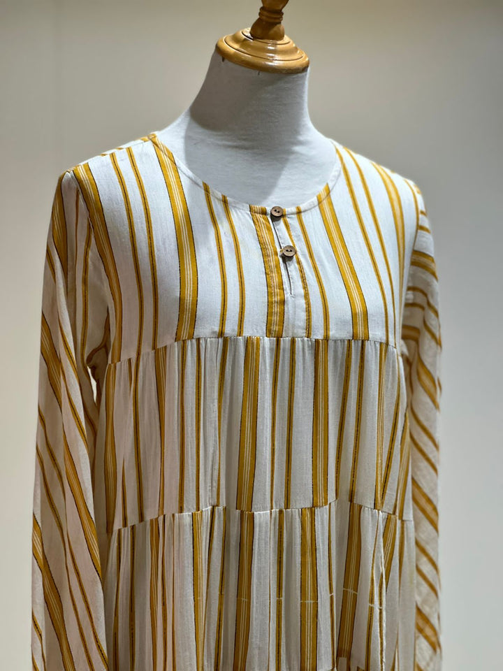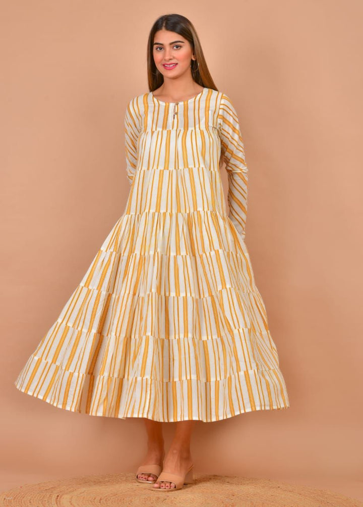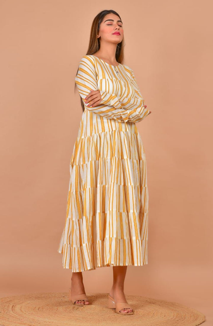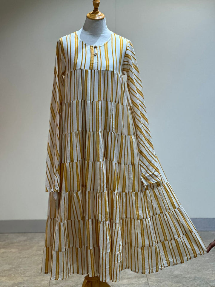 Mul cotton stripes printed long flared dress with chudi sleeves.